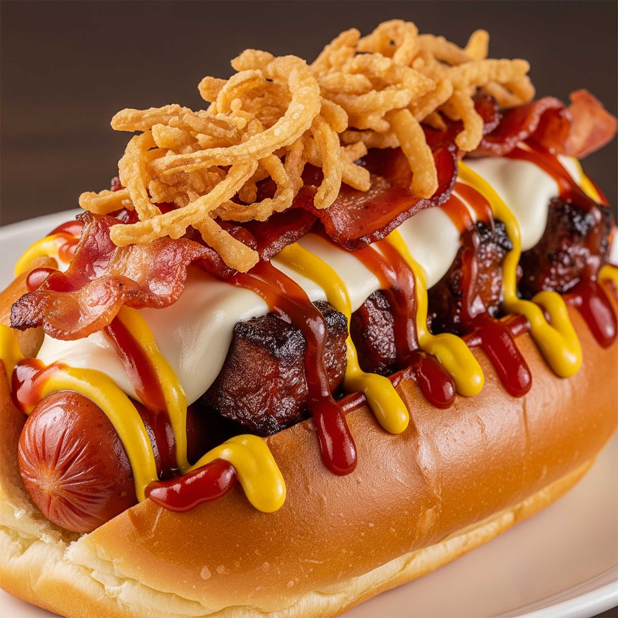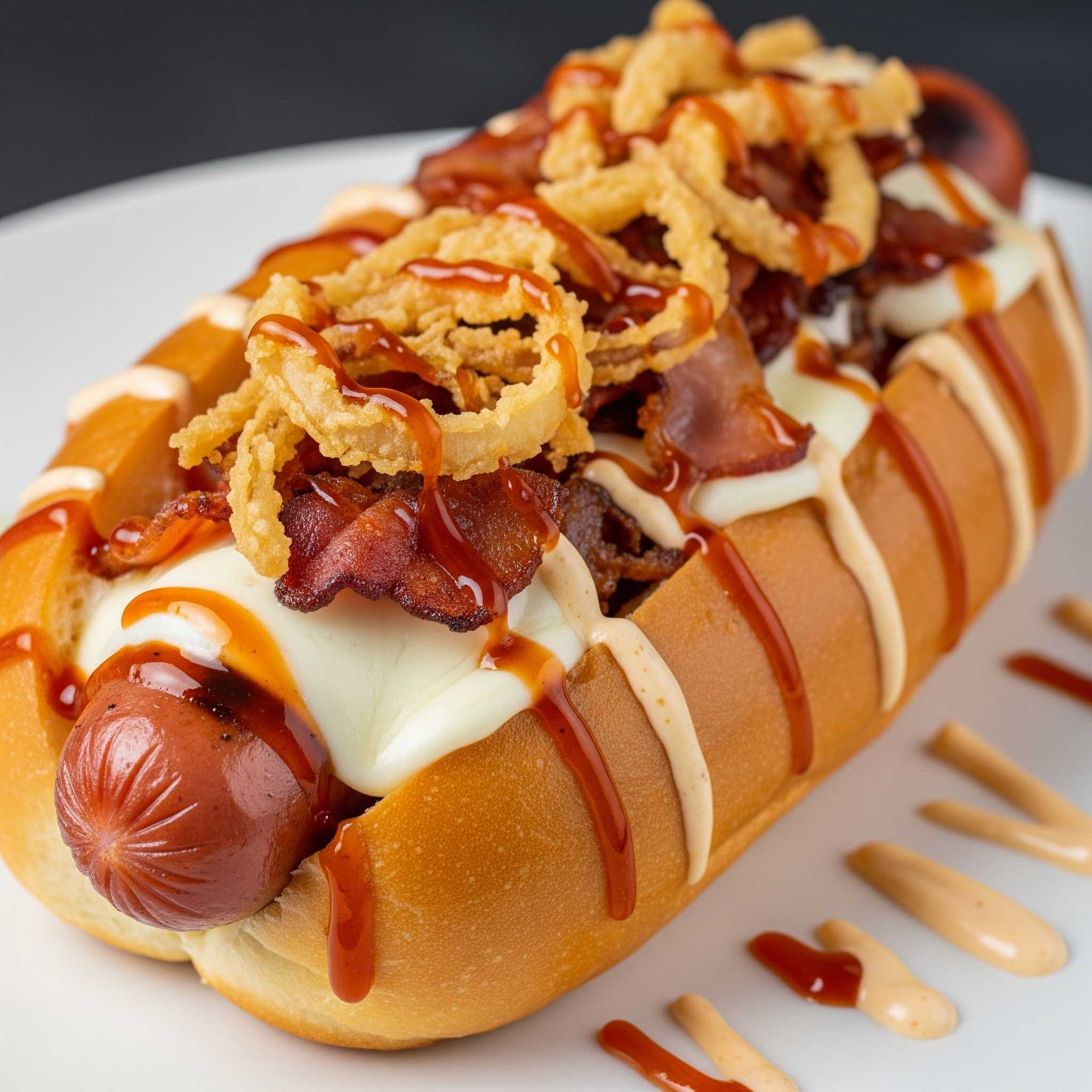 Pan brioche, salchicha americana, doble queso mozzarella, tocineta, cebolla frita, ripio de papa y salsas al gusto.