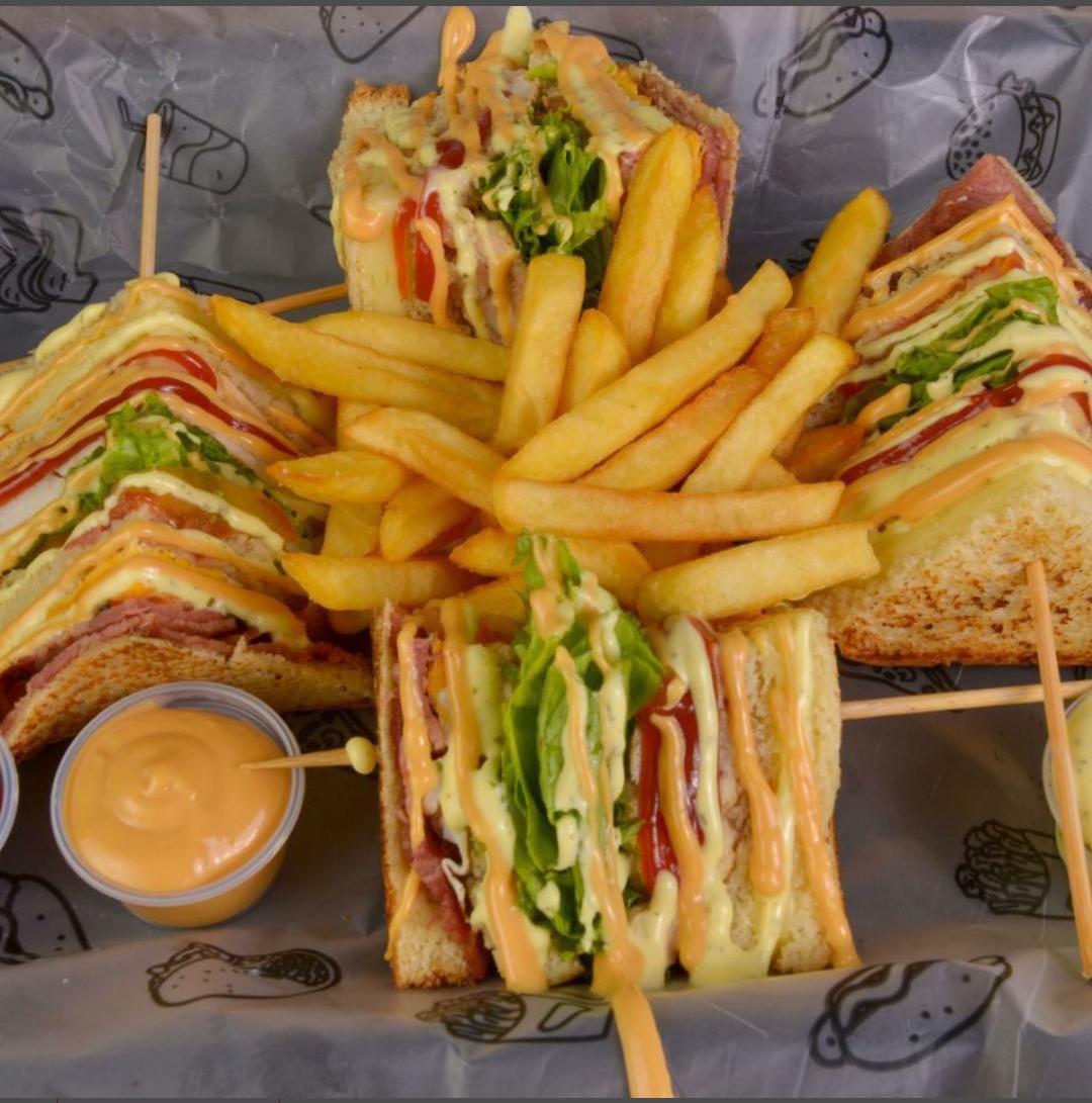Pan tajado, vegetales, lechuga, tomate, cebolla natural, trozos de pollo, tocineta, huevo, salsa premium y papas a la francesa.