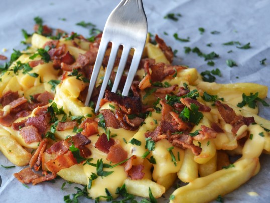 Papas a la francesa, papa criolla, queso fundido, tocineta, maduro y salsas de la casa.