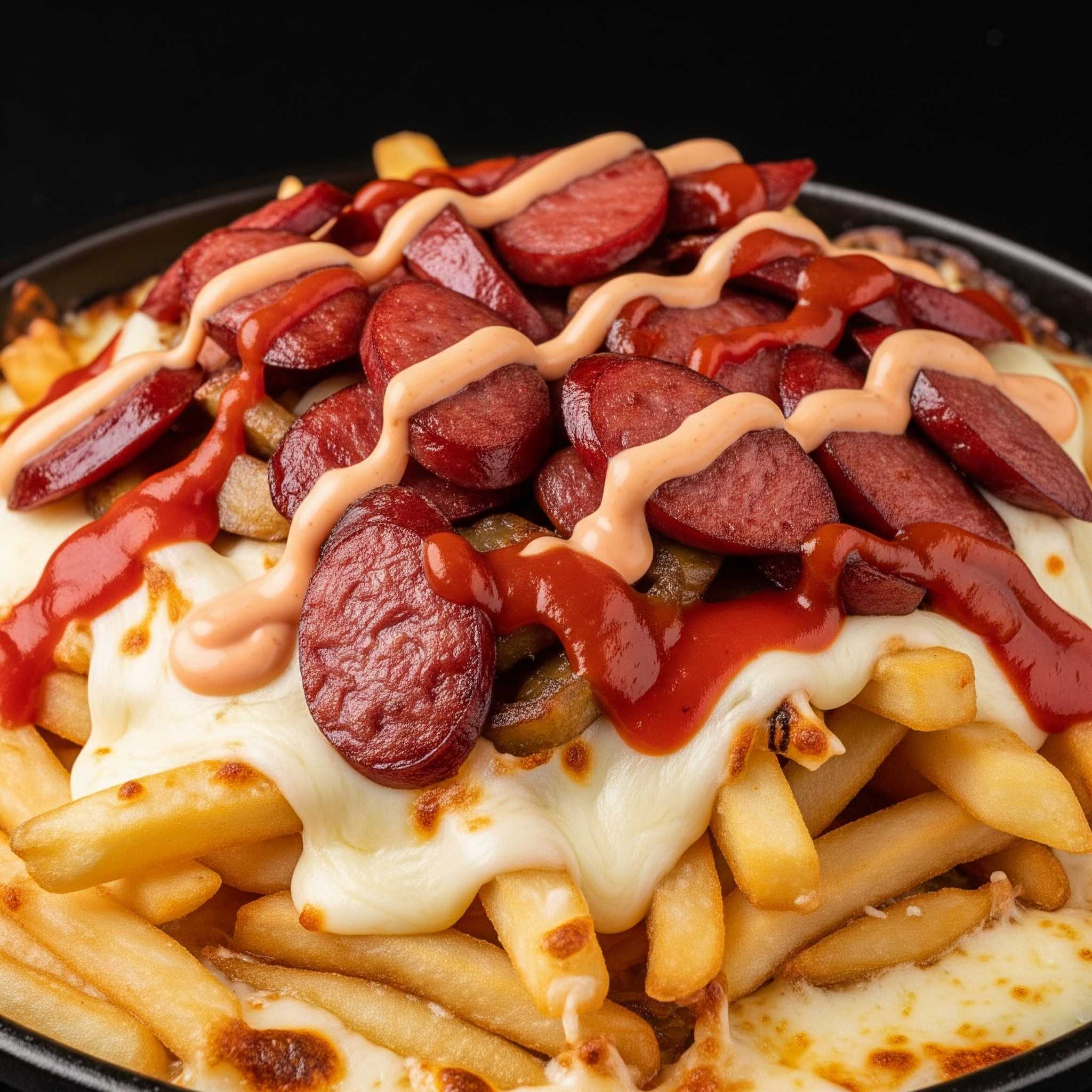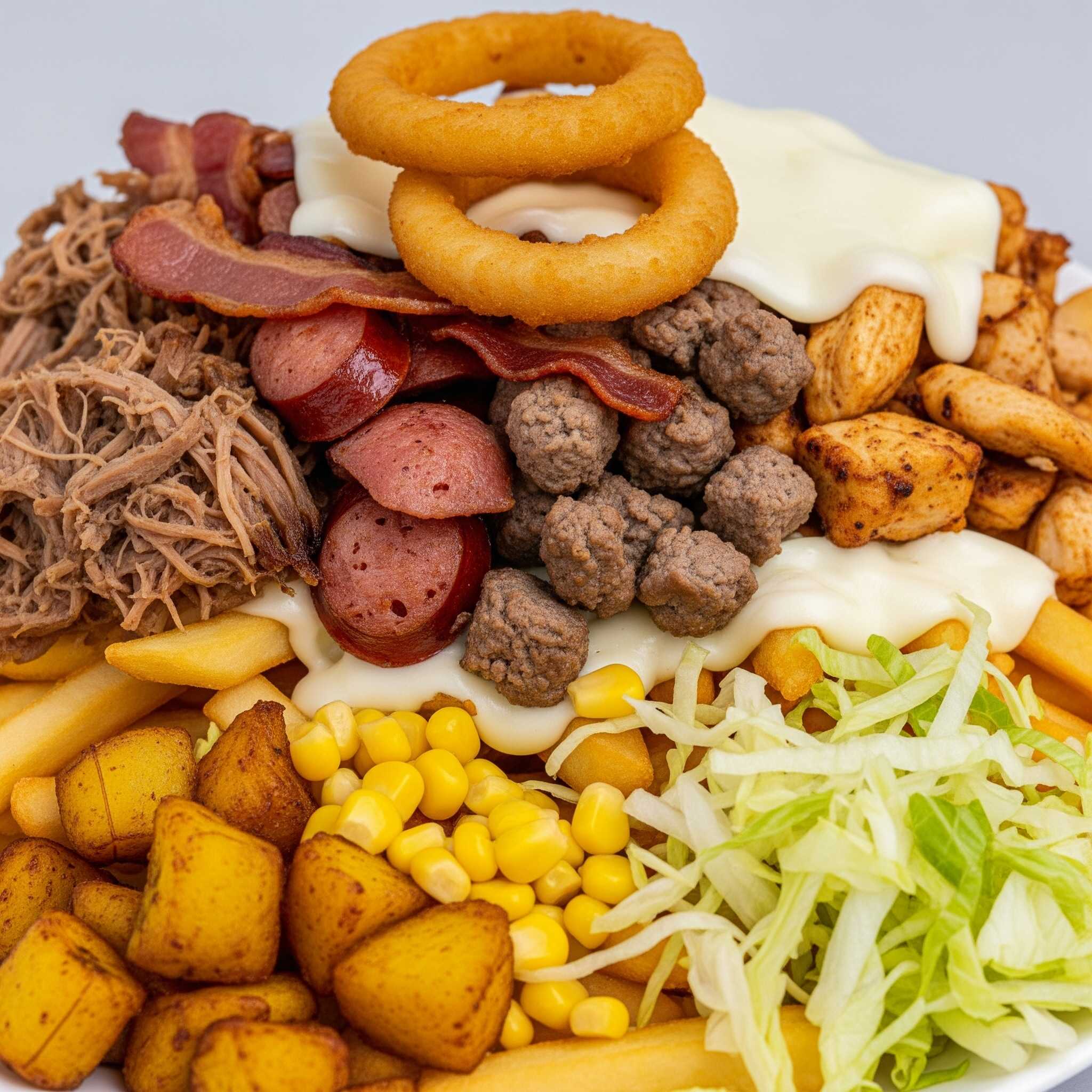 Maíz dulce, queso fundido, pollo desmechado, salchicha campesina, tocineta y papas a la francesa.