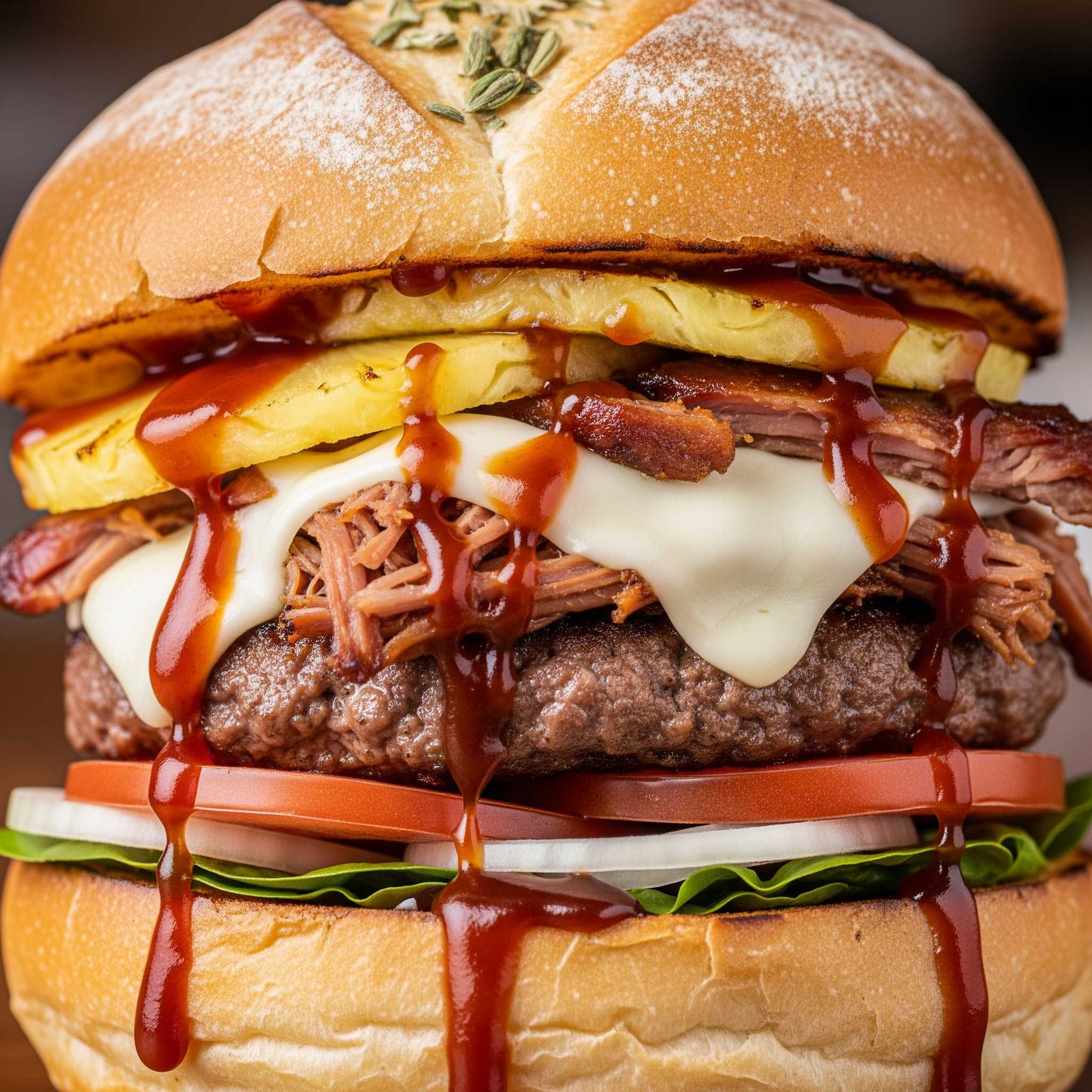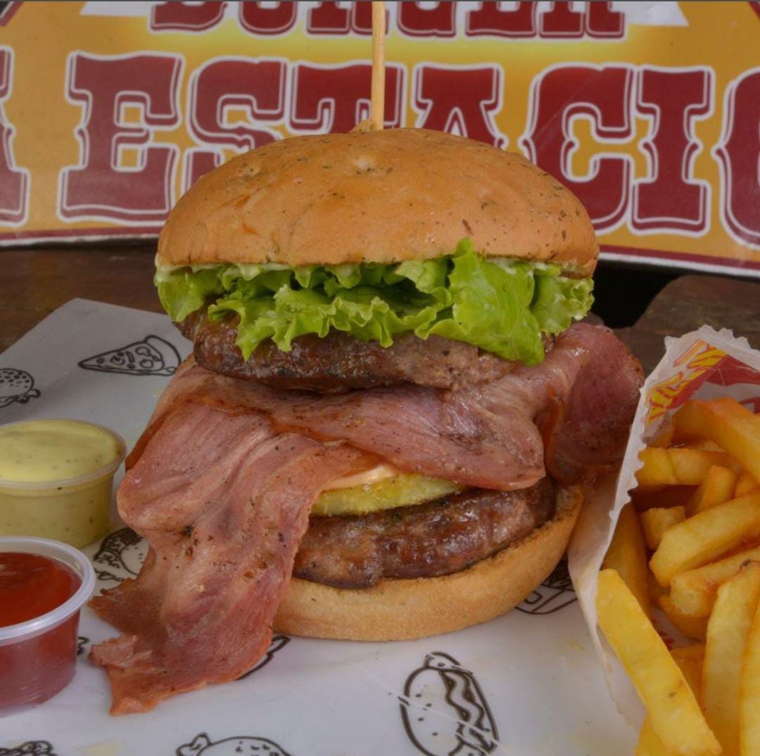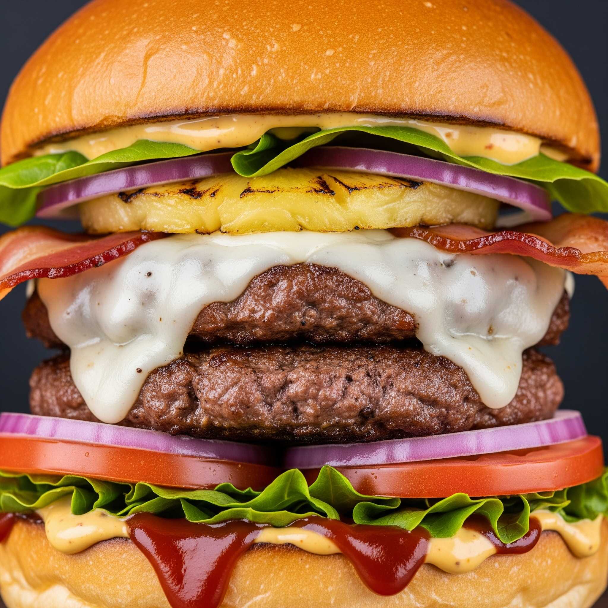 Pan artesanal, doble carne de res (300 g), queso, piña asada, lechuga, tocineta, cebolla natural, tomate y salsas de la casa más porción papas.