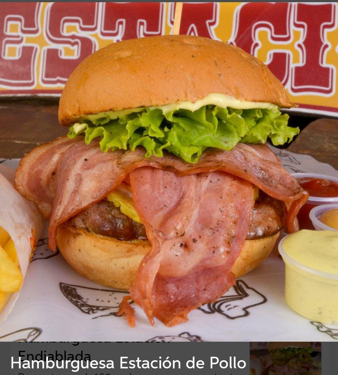 Pan artesanal, 150 g de carne de pollo, queso, tocineta, piña asada, lechuga, cebolla, tomate y salsas de la casa más porción papas.