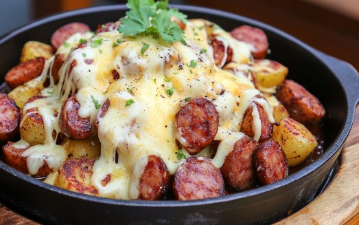 Papa criolla, salchicha Rich's, queso, ripio de papa y salsas al gusto.