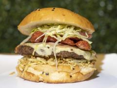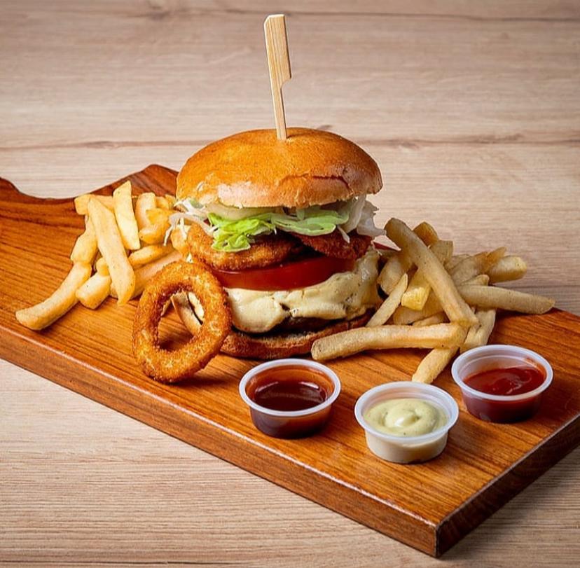 Carne 100 % angus, filete de pollo, pan artesanal, queso cheddar, tomate, lechuga, aros de cebolla, salsas de la casa, acompañado depapa criolla.