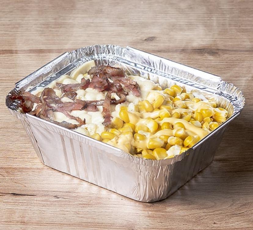 Pollo desmechado, maíz, tocineta, papa a elección ripio de papas, queso mozarella fundido, salsas