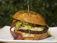 Carne 100 % angus, pan artesanal, queso cheddar, tomate, lechuga, aros de cebolla, salsas de la casa, acompañada de papa criolla.