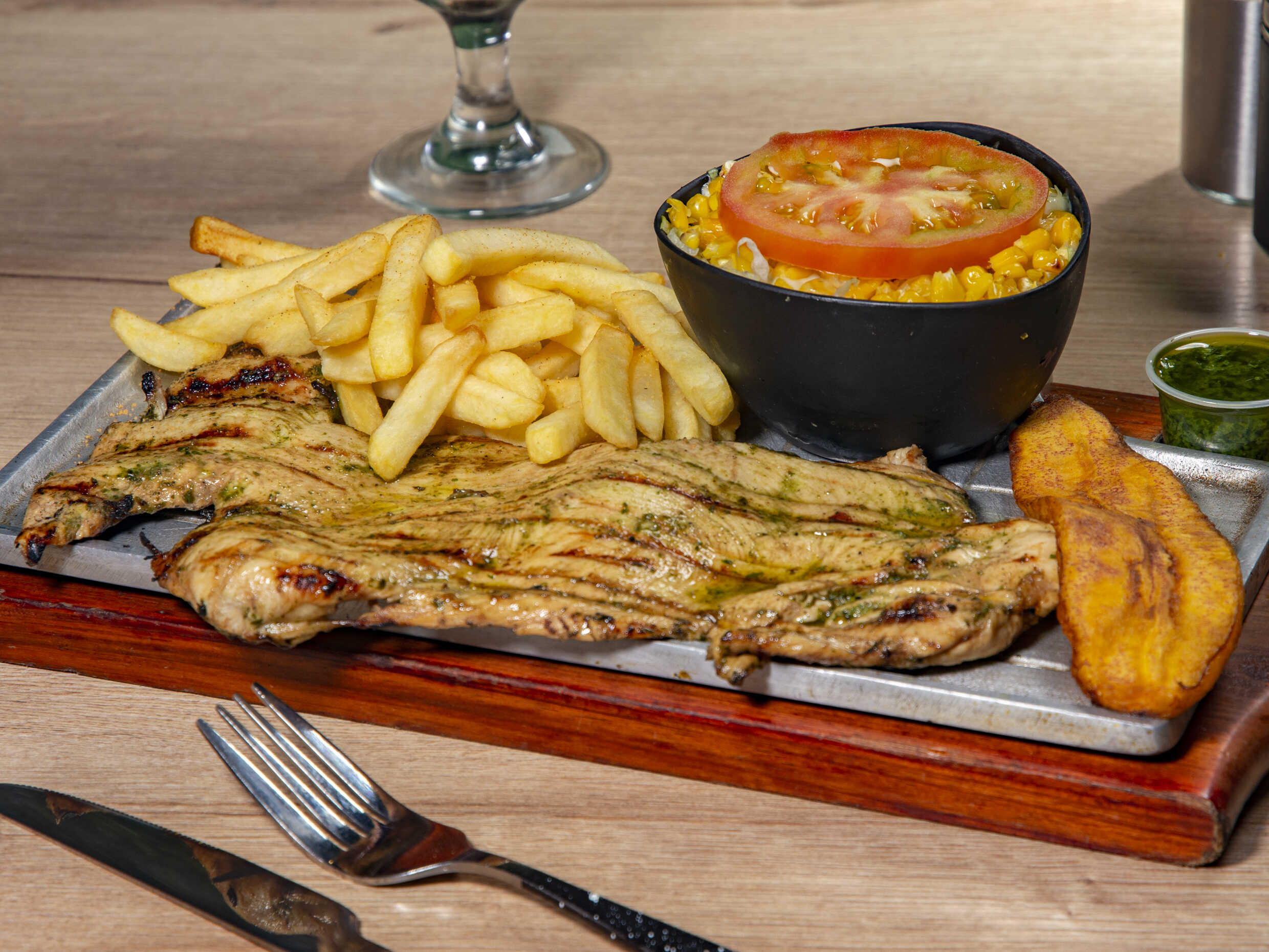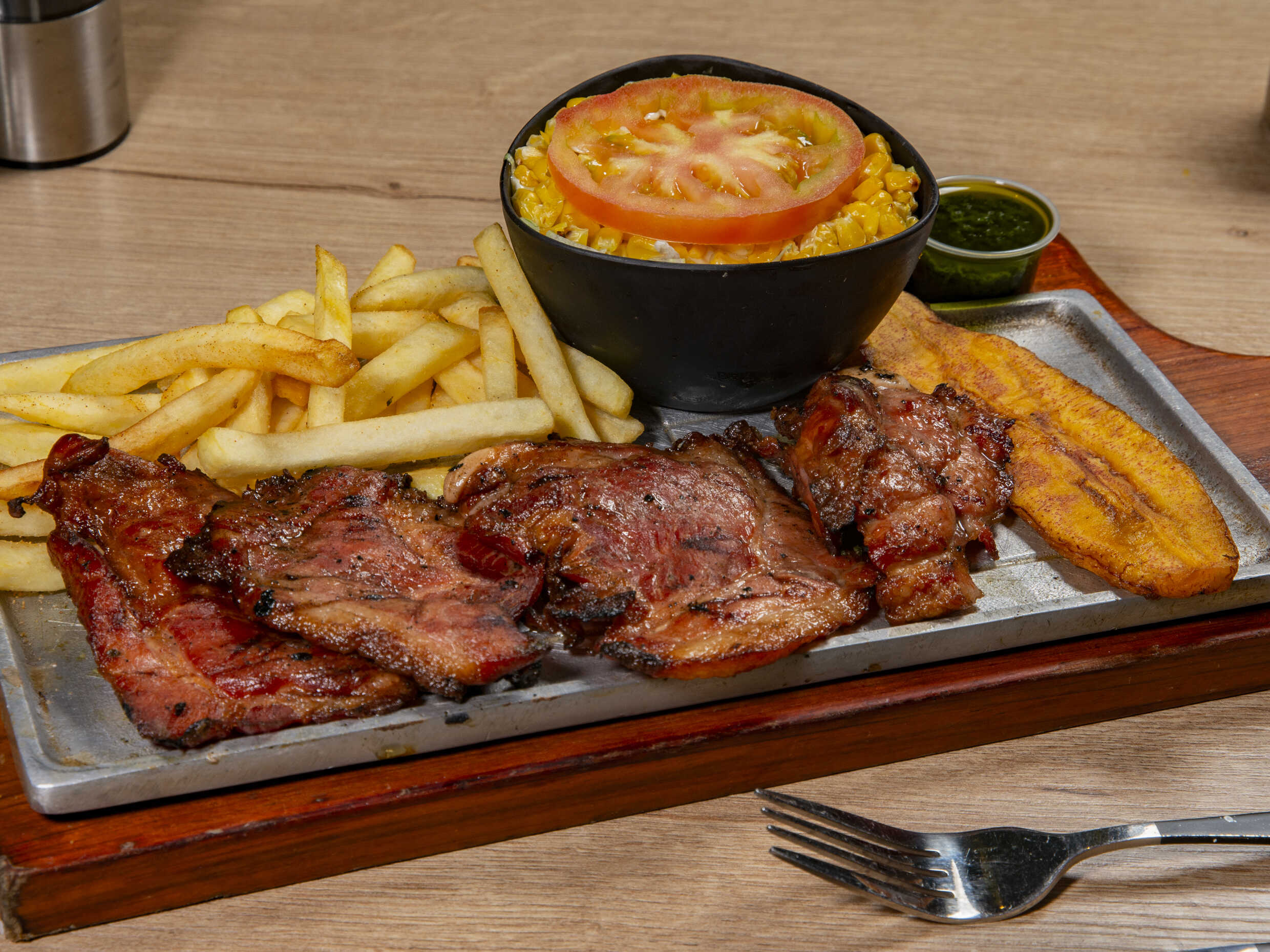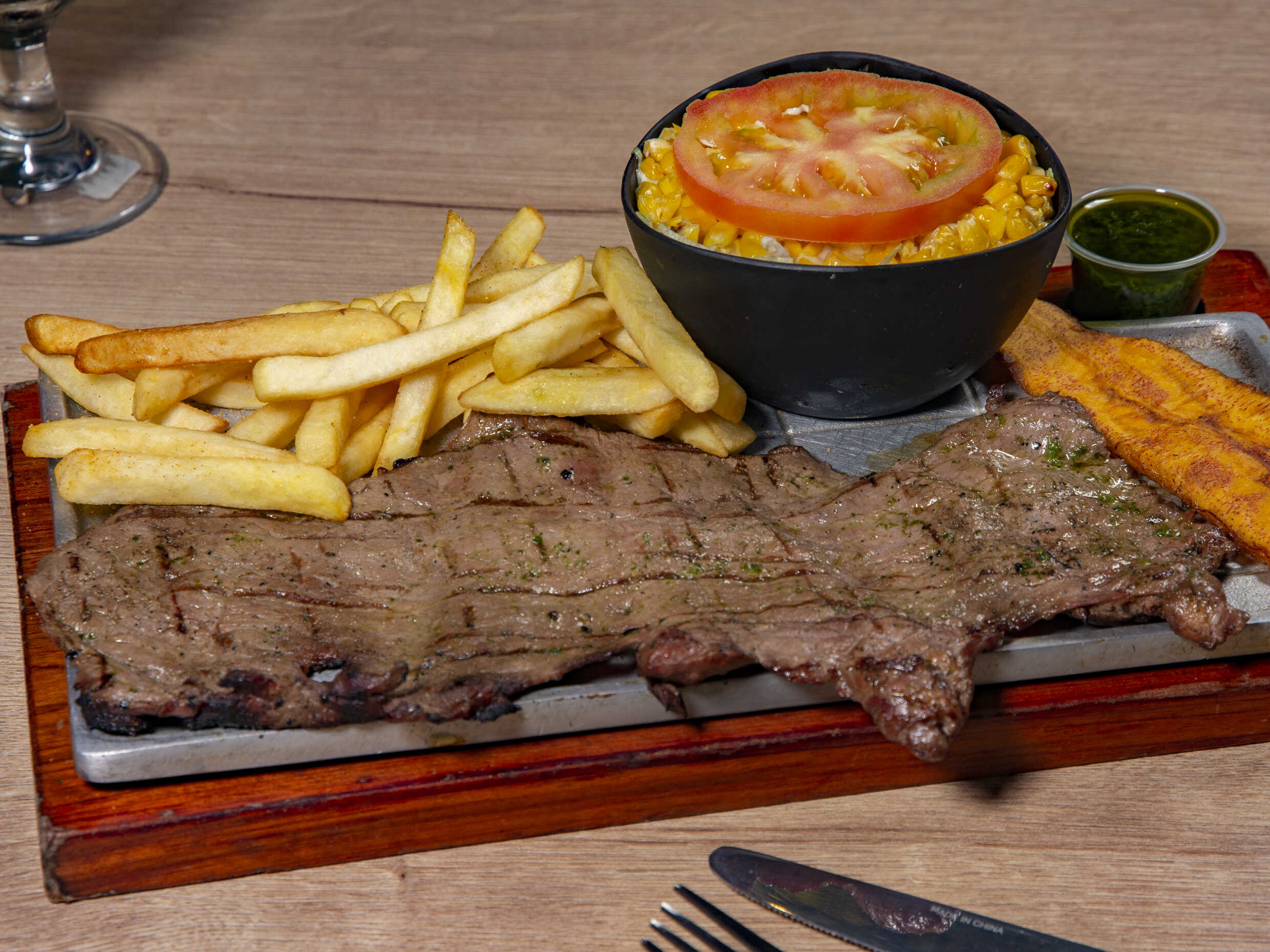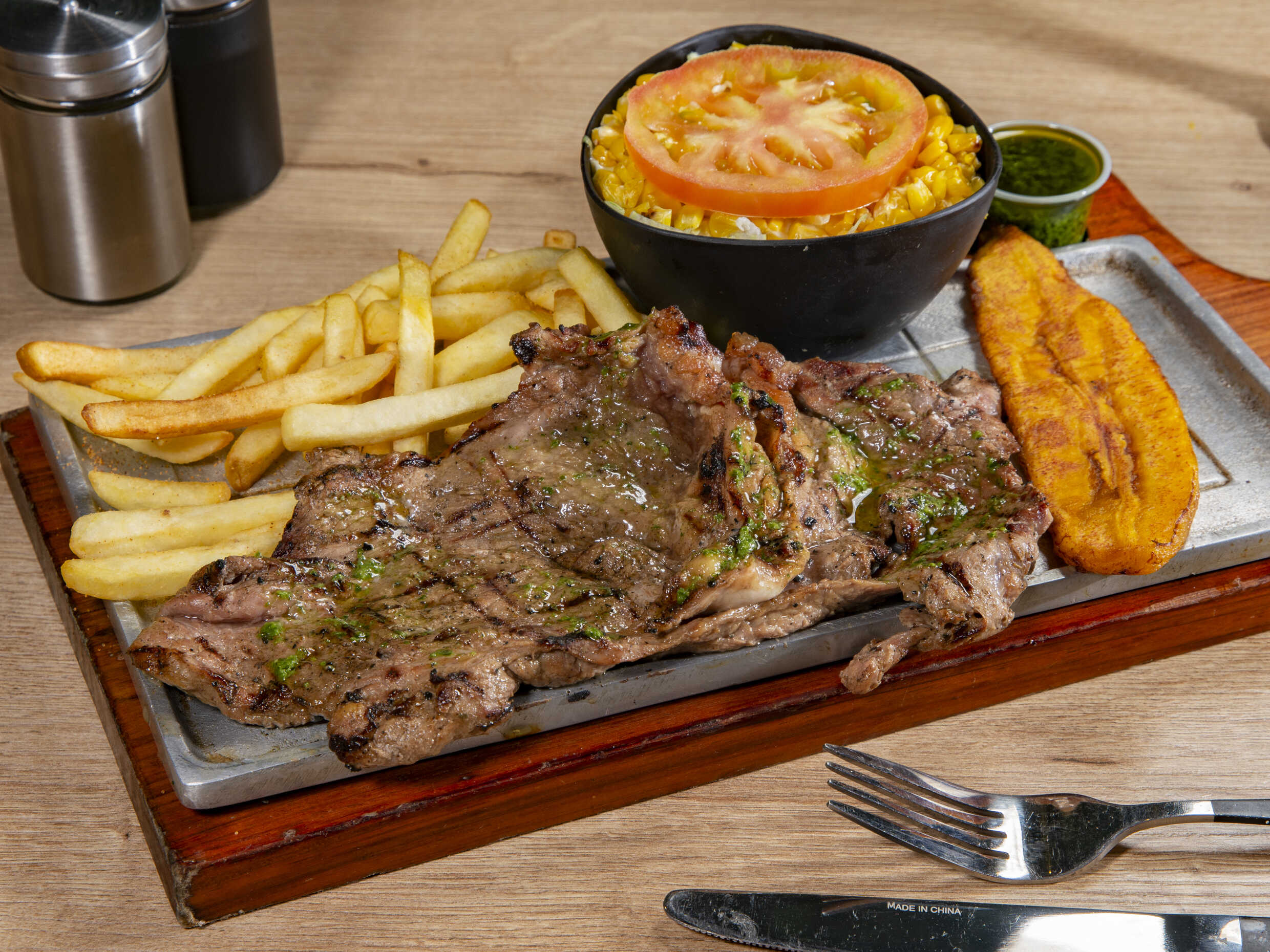 Churrasco, acompañado de papa al vapor, maduro y ensalada