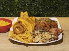 Pollo, res, cerdo, chorizo, costilla ahumada, papa a la francesa, croquetas de yuca, aros de cebolla, ensalada y maduro