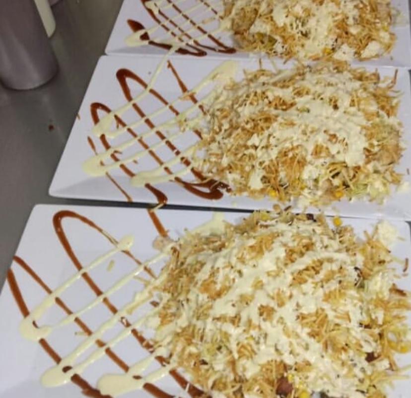Carne de res, filete de pollo, maíz tierno, queso fundido, lechuga, ripio de papa, salsa de la casa y salsa de maíz.