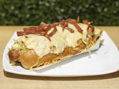 Salchicha, papa a elección, ripio de papas, queso mozarella fundido, salsas.