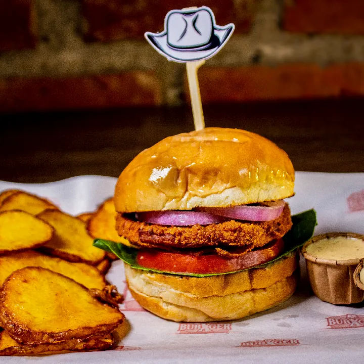 Carne 200 g 100% angus americana, filete de pollo crispy kokoriko 125 g, cebolla, tomate, queso americano, salsa de ajo y de la casa.