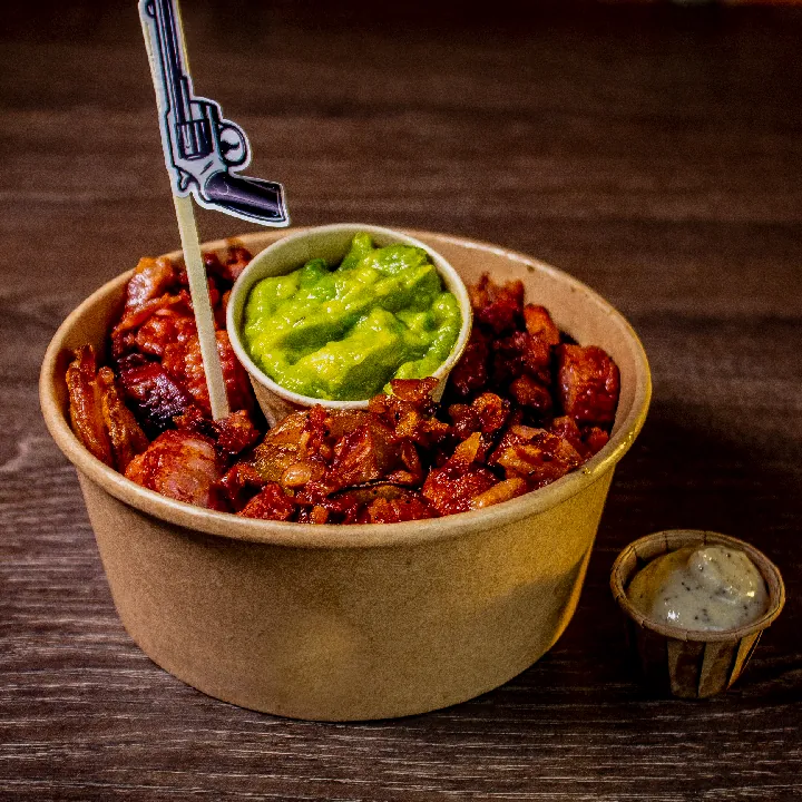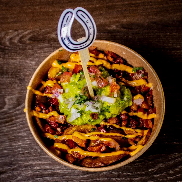 Base de papas criollas, sour cream, tocineta picada, guacamole de la casa, salsa de queso, pico de gallo, acompañado de nuestra deliciosa salsa chipotle semi picante.