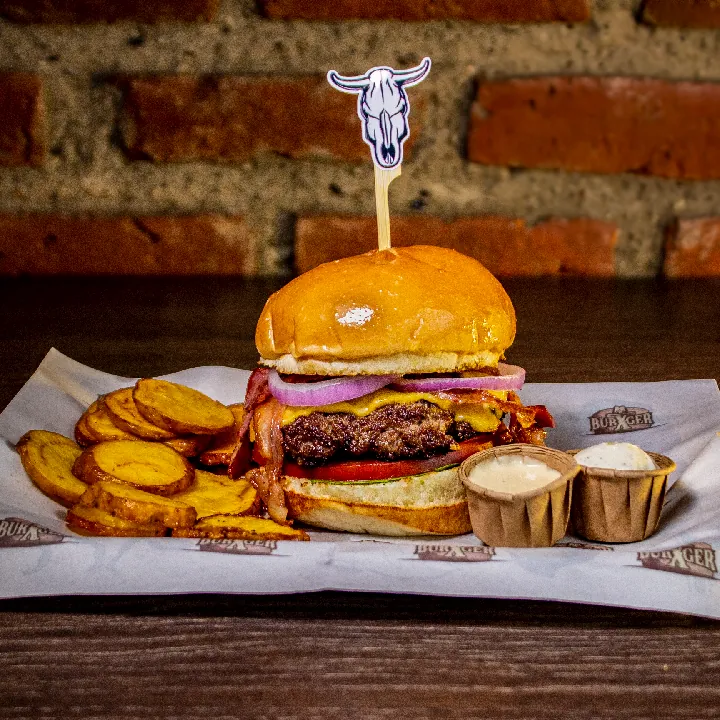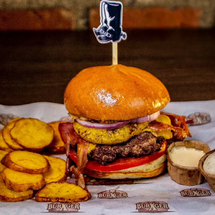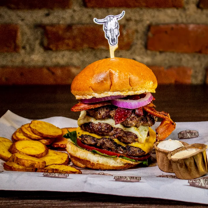Dos carnes 250 g 100% angus americana, queso americano, tocineta, 3 aros de cebolla, salsa de ajo y de la casa.