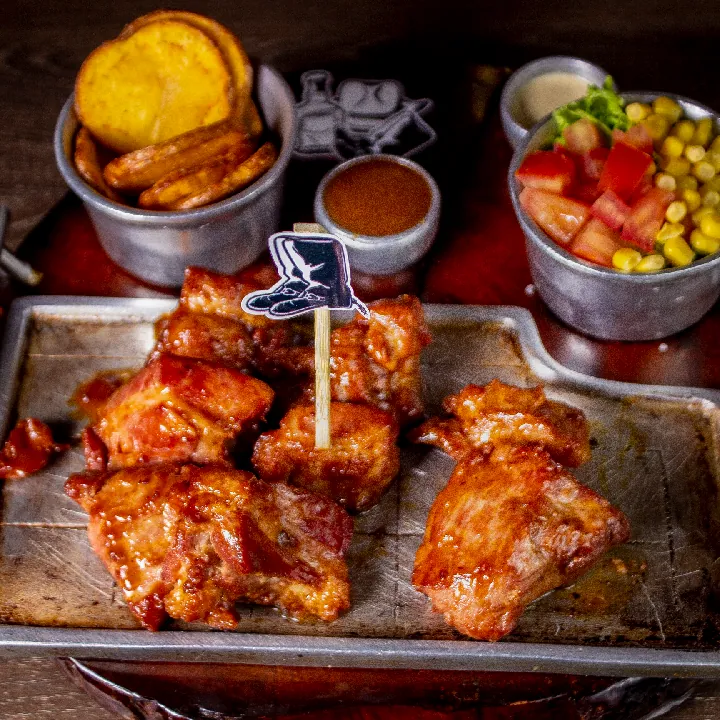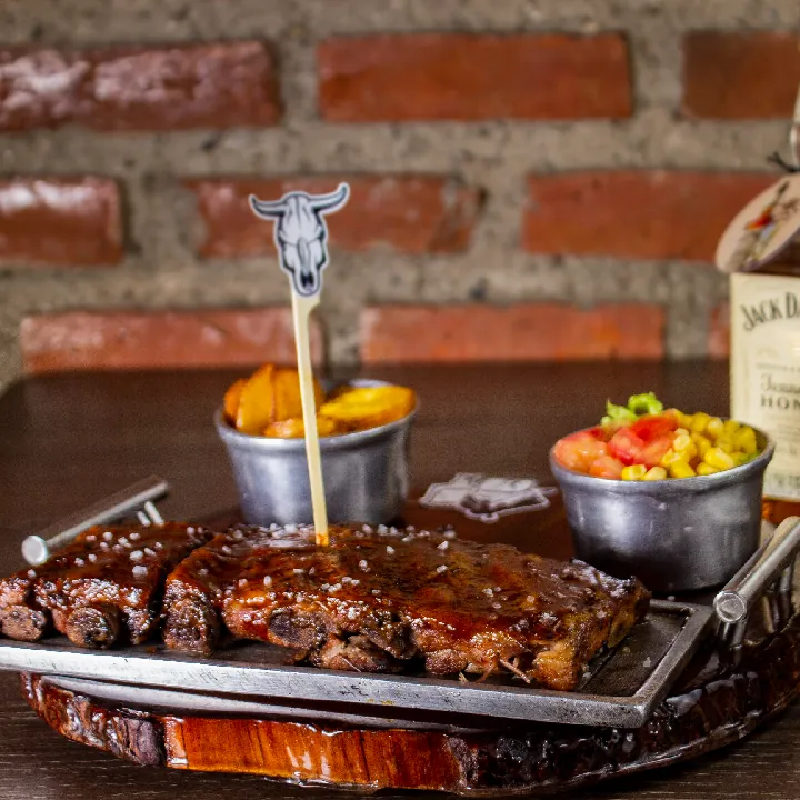 450 g De costilla S.T Louis marinada en salsa BBQ aromatizada con acompañado de papa criolla y ensalada de la casa.