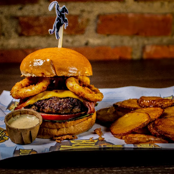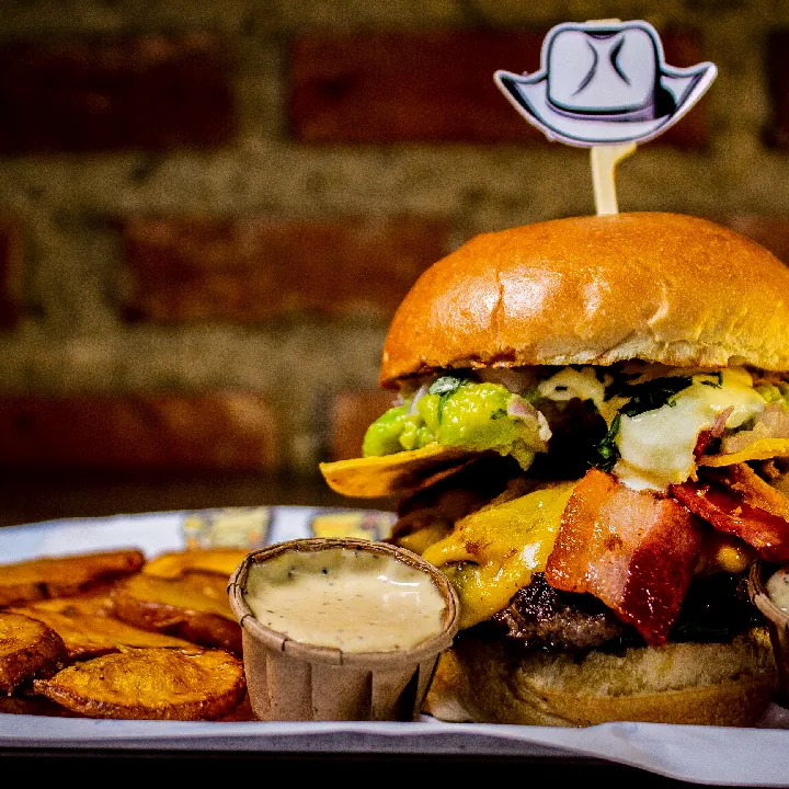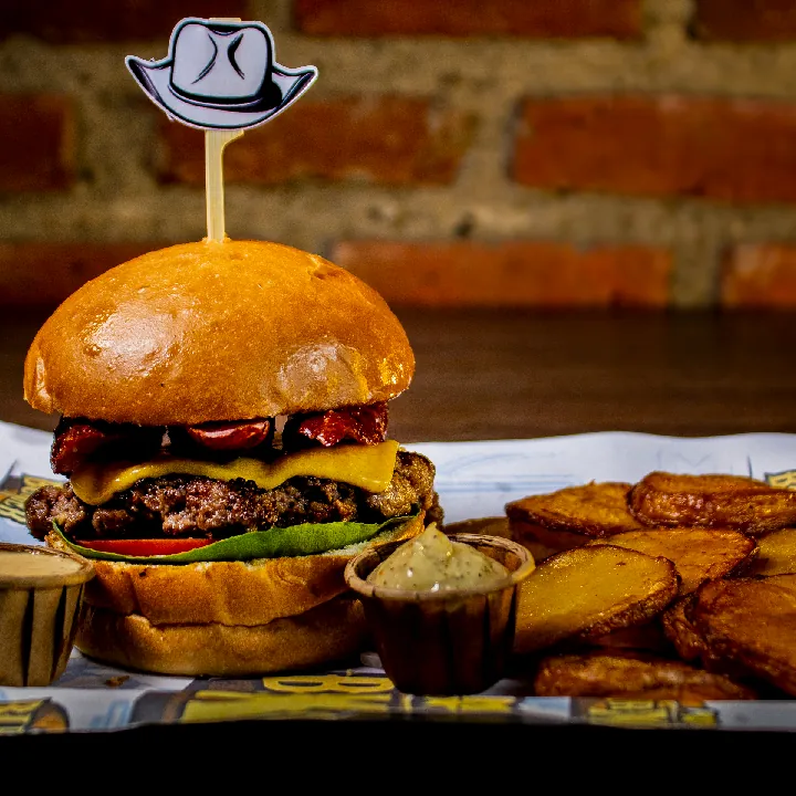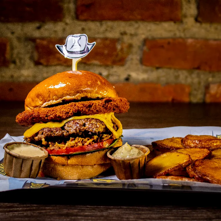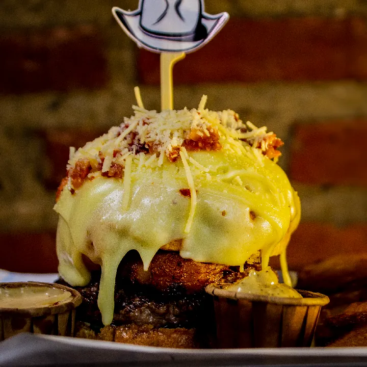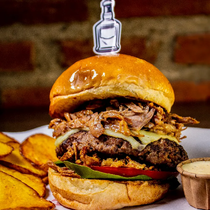 Carne 250 g 100% angus americana, 200 g pulled pork S.T. Louis aromatizado con Jack daniels, queso americano y mozzarella, tocineta, cebolla crunchy y salsa de ajo.