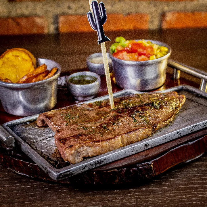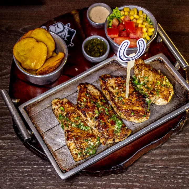 400 g De costilla ahumada natural sin hueso, salsa BBQ de la casa, acompañado de papa criolla y ensalada de la casa.