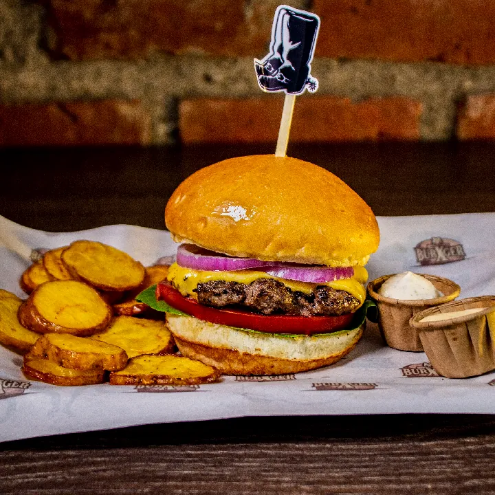 Carne 200 g 100% angus americana, cebolla, tomate, queso americano, parmesano y mozzarella, salsa de ajo y de la casa.