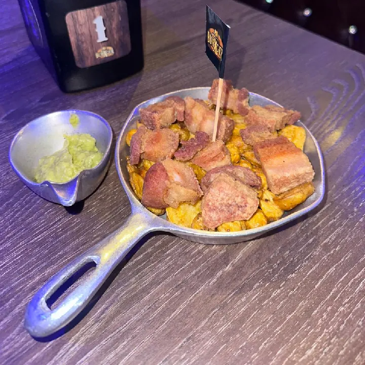 Base de papas criollas, chicharrón de cerdo crujiente acompañado de guacamole.