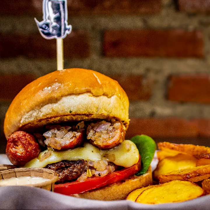 Mezcla de carne 100% angus americana, y santo chorizo 200 g, cebolla, tomate, queso mozzarella, chimichurri y salsa chipotle.