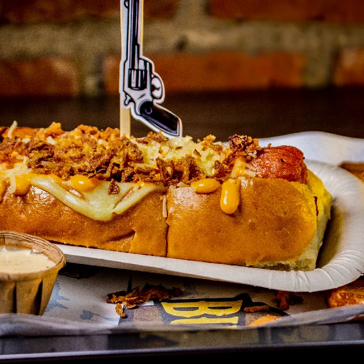 Salchicha americana zenú, pan brioche, cebolla, queso mozzarella, salsa de queso americano tocineta, papa criolla, salsa de ajo y de la casa.