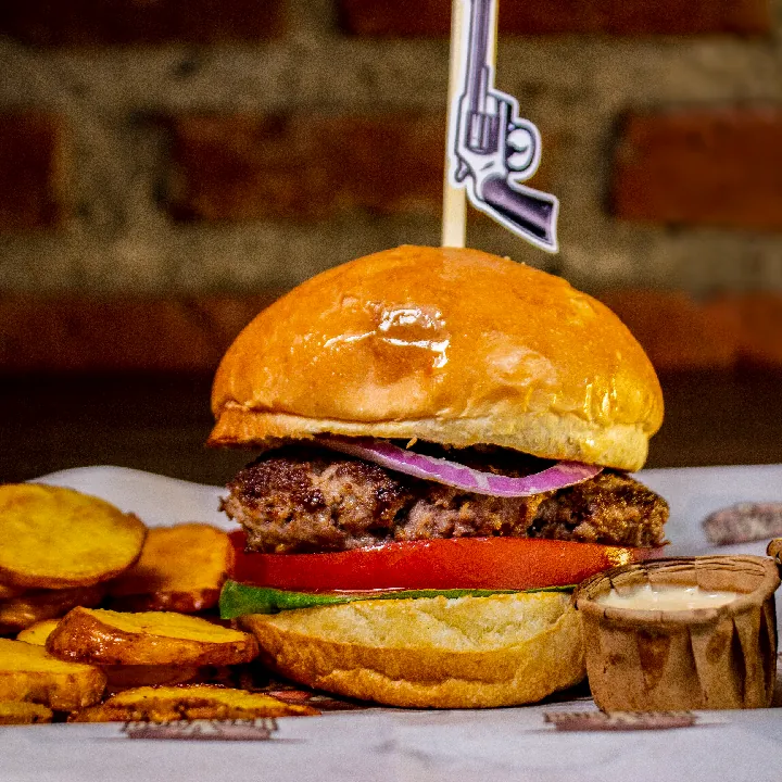 Carne 200 g 100% angus americana, cebolla, tomate, tocineta, queso americano, 3 aros de cebolla, salsa de ajo y de la casa.