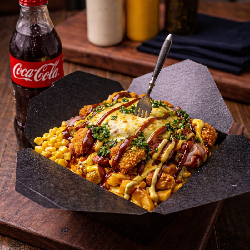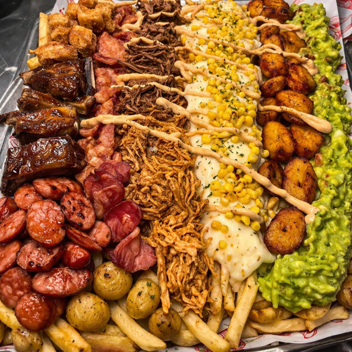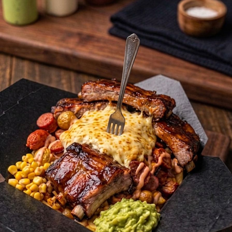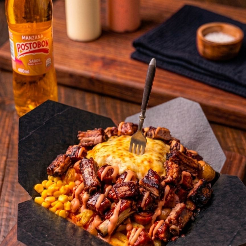 Salchicha, Papa criolla o Francesa, Tocineta ahumada, Maduro, Costilla ahumada, Chorizo artesanal, maízcitos, queso mozzarella, salsa de la casa y Guacamole