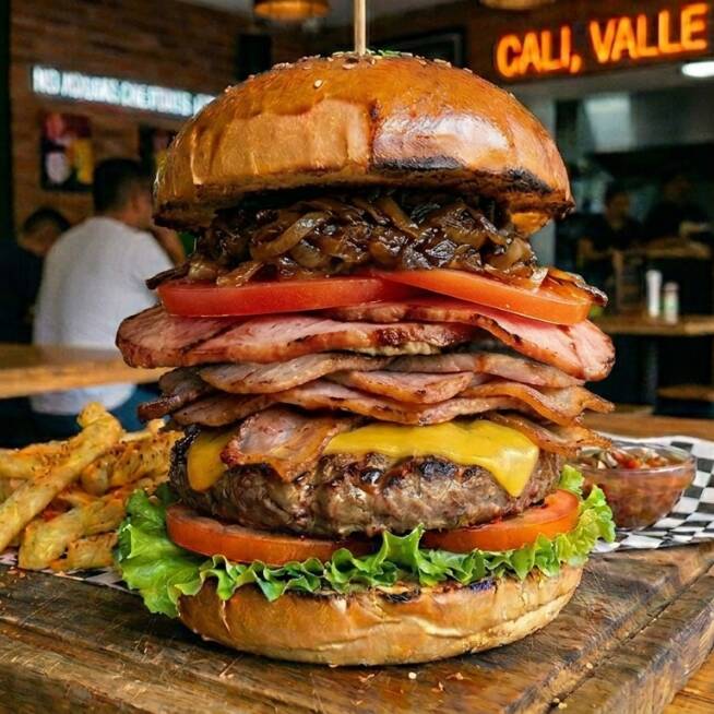 Pan de Hamburguesa, carnes artesanal, chorizo ahumado, tocineta ahumada, Jamón, lechuga, tomate, cebolla caramelizada, queso mozzarella. Con Papas Medianas y Gaseosa 400ml