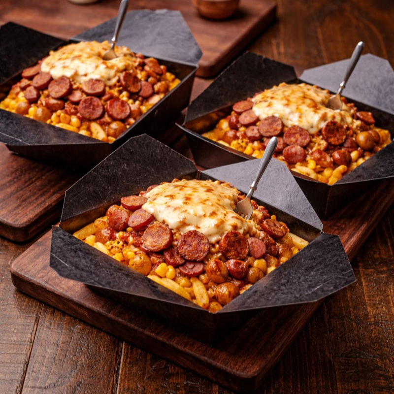 Salchicha, Papa criolla o Francesa, Tocineta ahumada, Pollo mechado, Crush de pechuga de pollo, Maduro, maízcitos, Queso mozzarella, salsa de la casa Salchipapa #4 La Salchi-clasica: Salchicha, Papa criolla o Francesa, Maduro, Chorizo artesanal, Queso mozzarella, salsa de la casa.