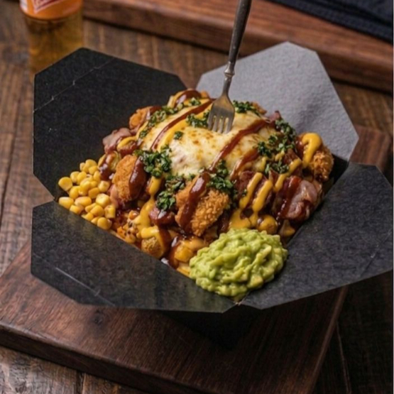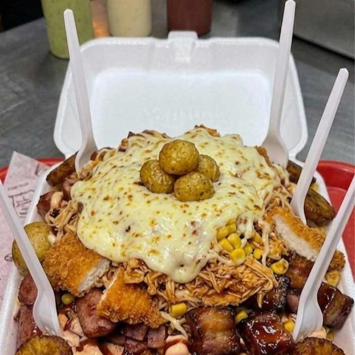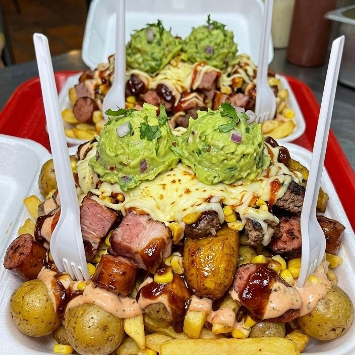 Salchicha, Papa criolla o Francesa, Tocineta ahumada, Pollo mechado, Chicharrón, Maduro, Costilla ahumada, Chorizo artesanal, maizcitos, Queso mozzarella, salsa de la casa y Guacamole.