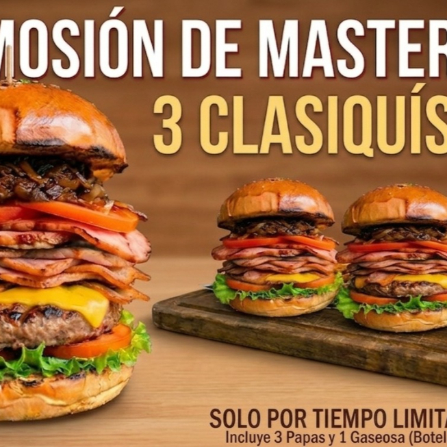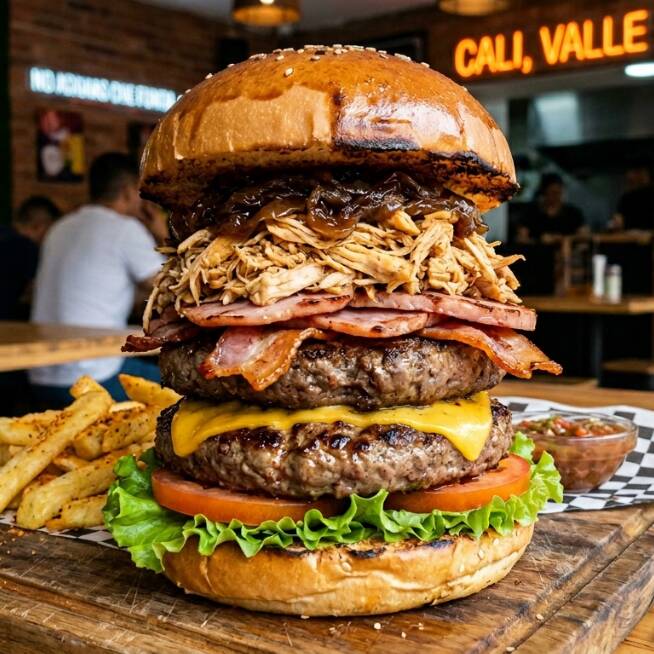 Pan de Hamburguesa, Doble carnes artesanal, pechuga de pollo despechada, tocineta ahumada, Jamón, lechuga, tomate, cebolla caramelizada, cubierta de queso mozzarella. Con Papas Medianas y Gaseosa 400ml