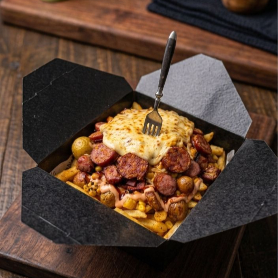 Salchicha, Papa criolla o Francesa, Tocineta ahumada, Crush de pechuga de pollo, Maduro, maízcitos, Queso mozzarella, salsa de la casa