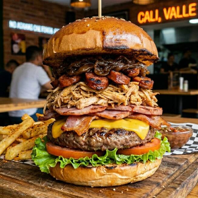 Salchicha, Papa criolla o Francesa, Tocineta ahumada, Carne de hamburguesa, Maduro, Costilla ahumada, Chorizo artesanal, maízcitos, queso mozzarella, salsa de la casa y Guacamole.