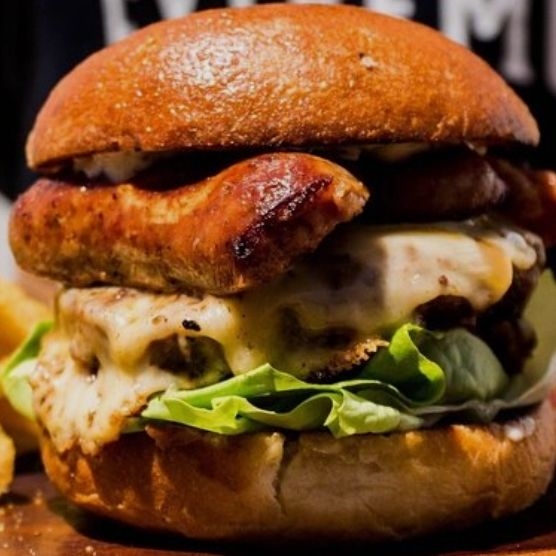 Pan brioche lechuga tomate Ripio salsas carne chorizo cebolla caramelizada tocineta queso cheddar y queso blanco
