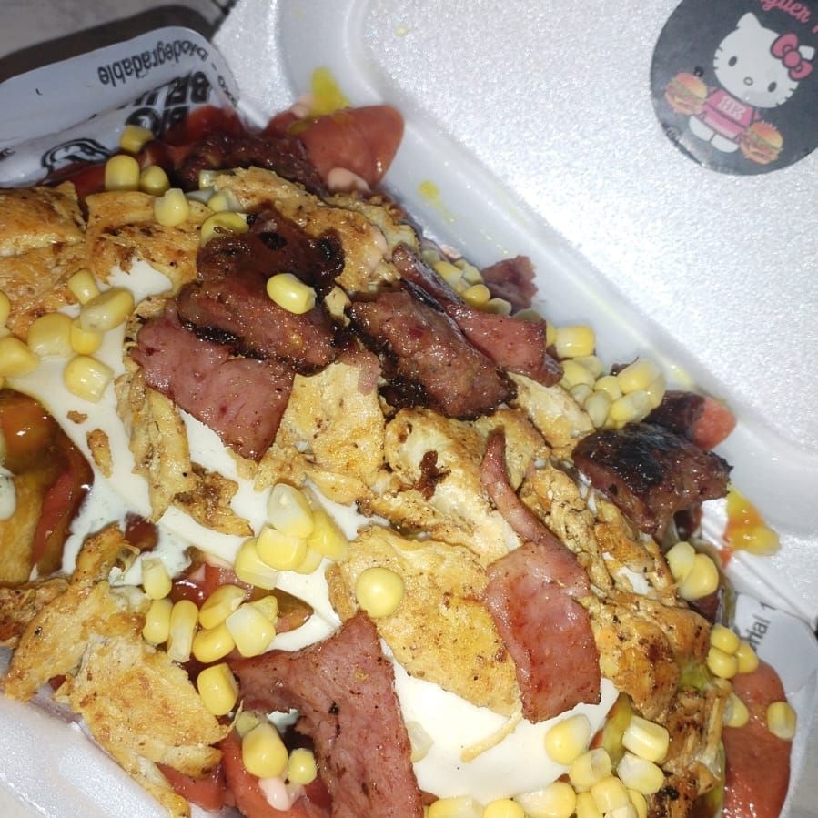 Pan, salchicha, cebolla caramelizada, ripio, salsas, queso, carne de hamburguesas y maíz.