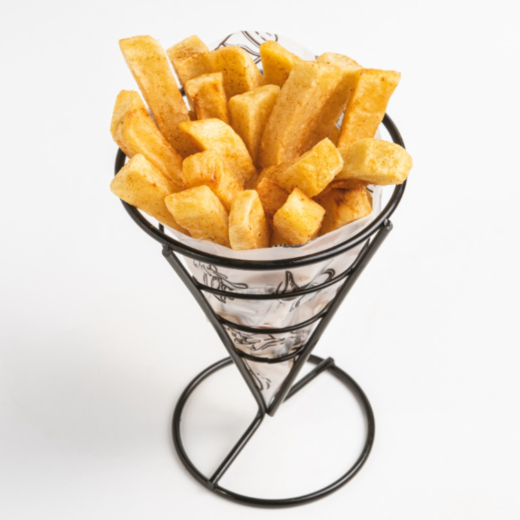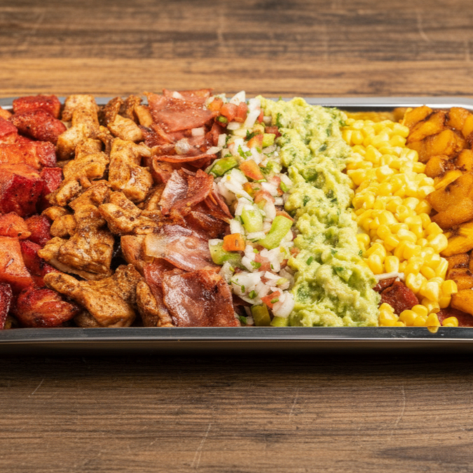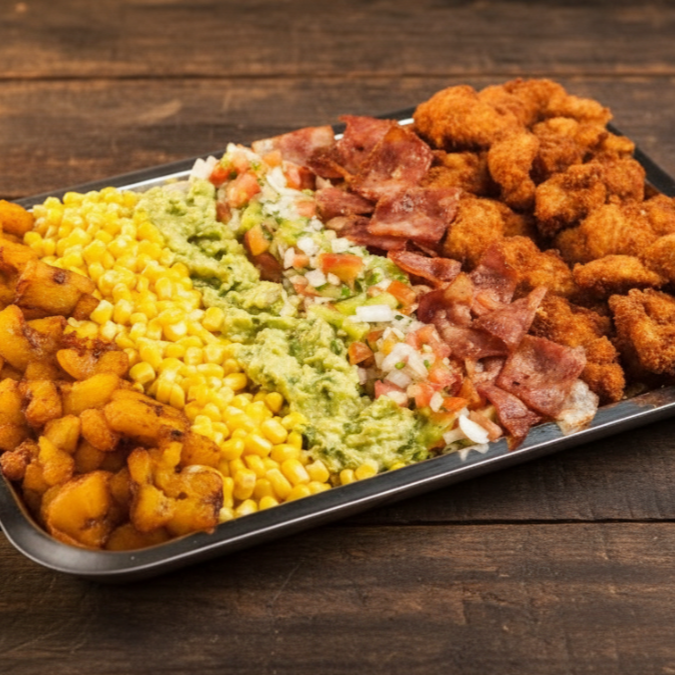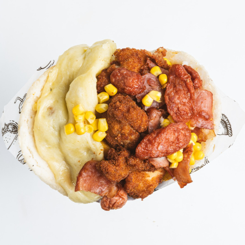 Crispetas de pollo, salchicha premium, papas, queso maduro, maíz tierno, tocineta, guacamole, pico de gallo.