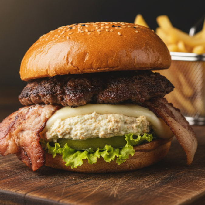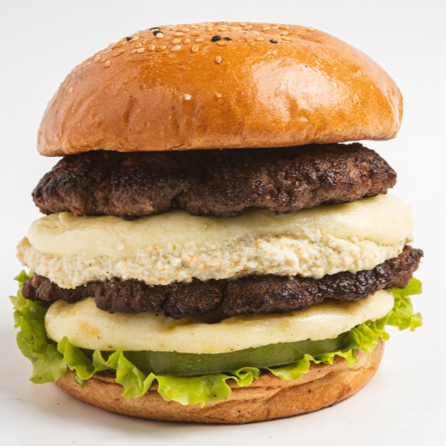 Doble carne Angus, doble queso, ensalada de la casa, lechuga crespa.