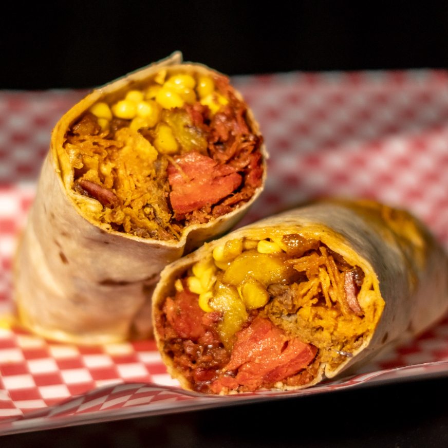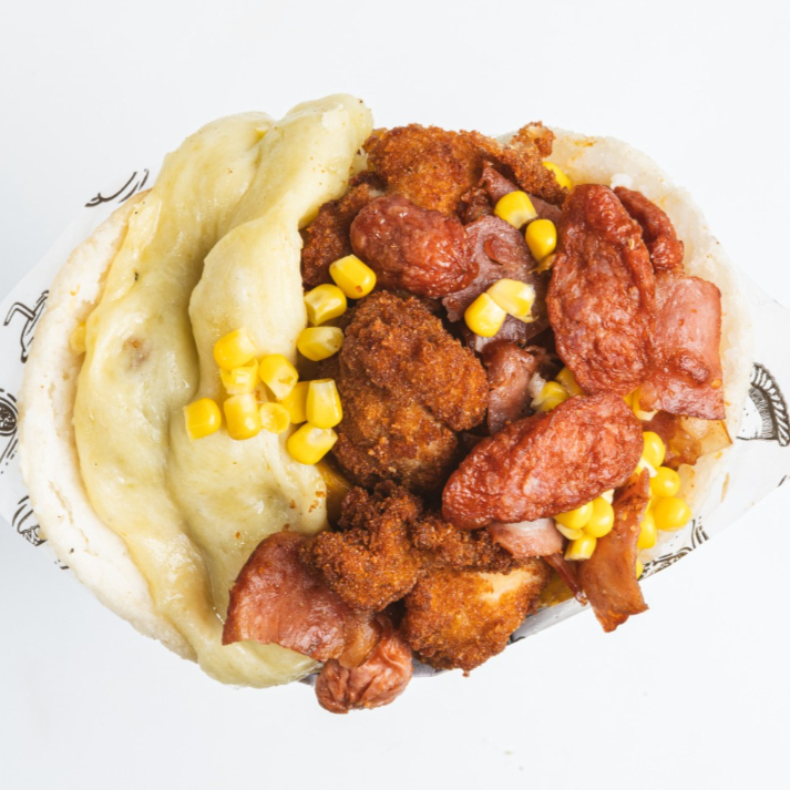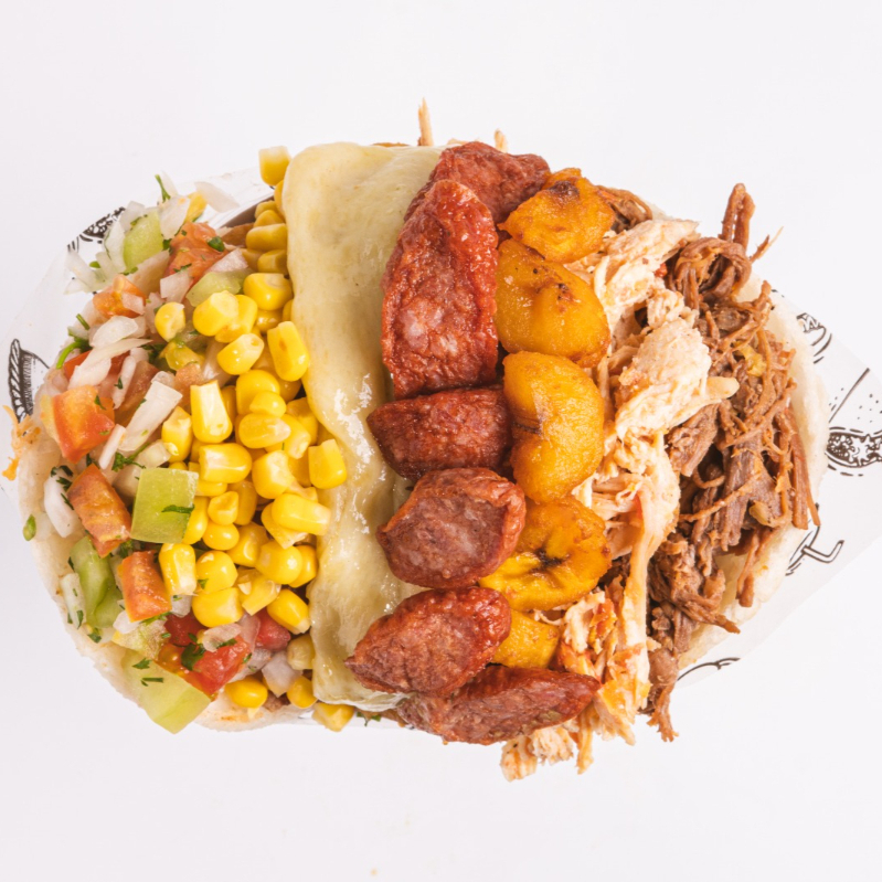 Deliciosa arepa con Pollo desmechado, res desmechada, 1 ranchera, maduro guayabo, maicitos dulces, pico gallo, queso fundido.
