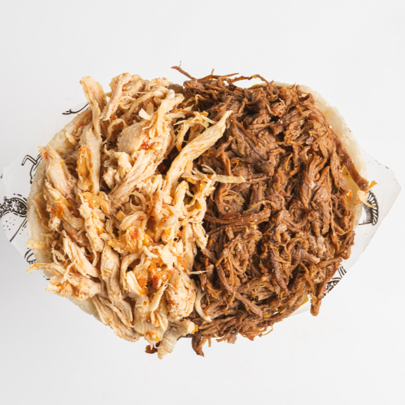 Deliciosa arepa con carne desmechada y pollo desmechado.