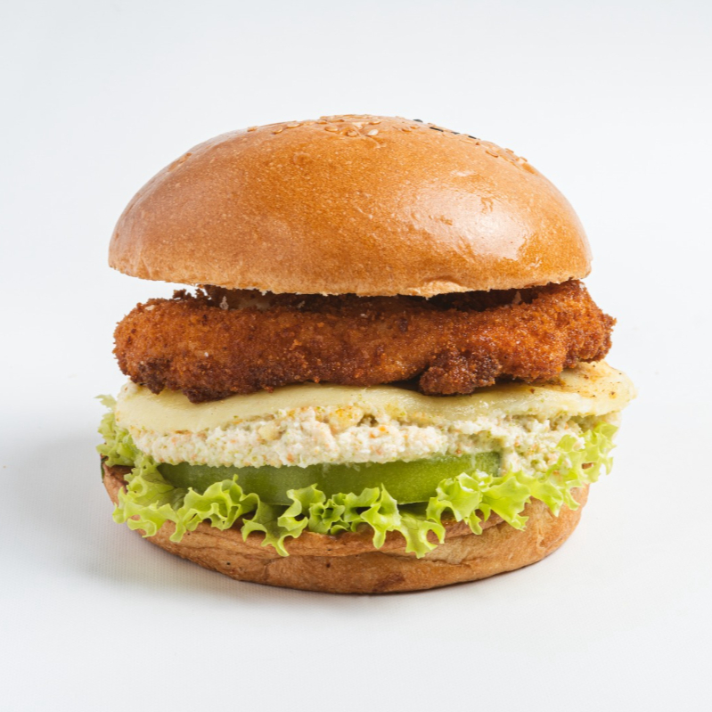 Pollo crispy, aros de cebolla, queso, ensalada de la casa, tomate, lechuga crespa.