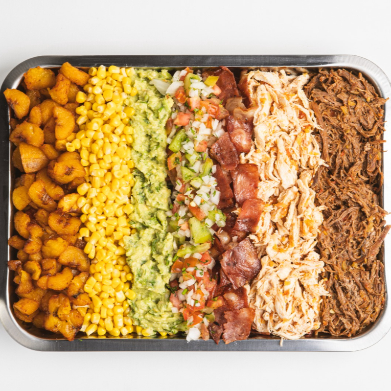 Pollo apanado, cerdo asado, carne ahumada, chicharrón, maicitos dulces, maduro guayabo, queso fundido.