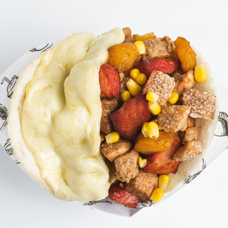 Deliciosa arepa con Carne ahumada, cerdo asado, chorizo artesanal, queso fundido, maduro guayabo, chicharrón.