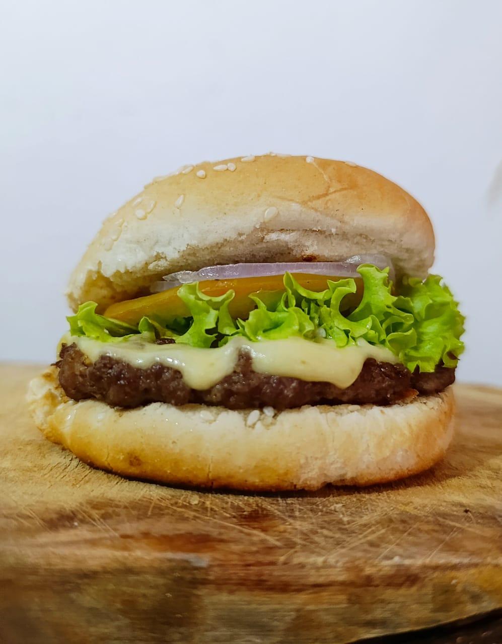 Pan, carne casera 60 gr, queso, cebolla, lechuga, tomate y salsa de la casa.