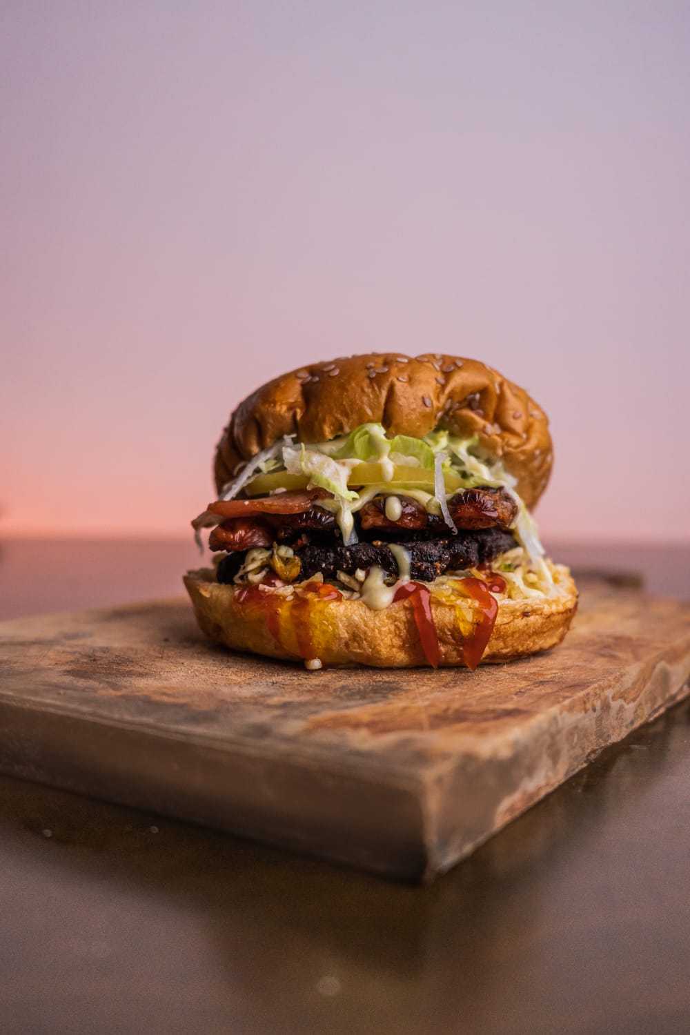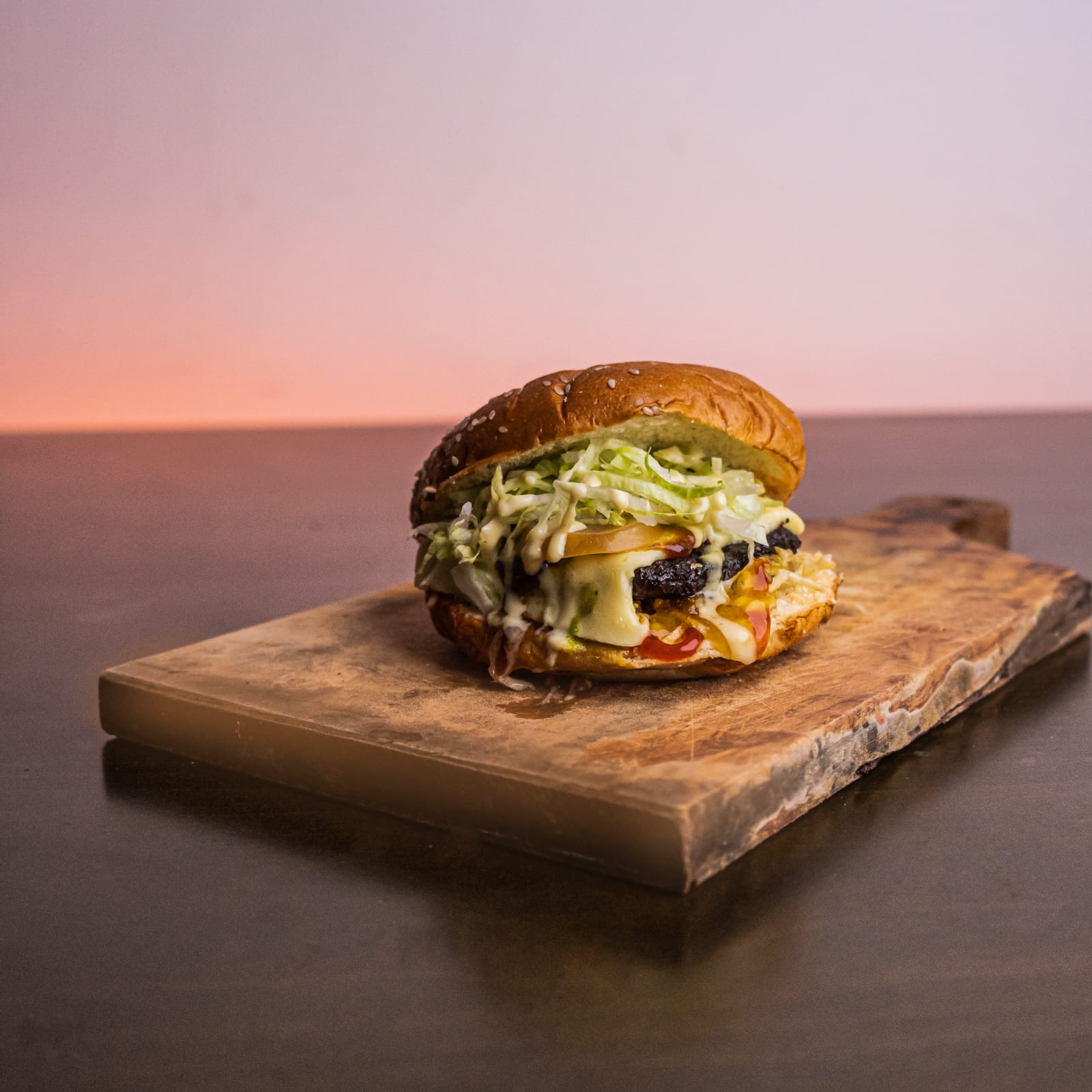 Dos jugosas carnes caseras de 100 g cada una, cubiertas con queso mozzarella derretido, tocineta crujiente y una mezcla perfecta de ripio de papa, salsa de tomate y nuestra salsa especial de la casa. Servida en un pan brioche doradito, con lechuga batavia fresca y rodajas de tomate natural.