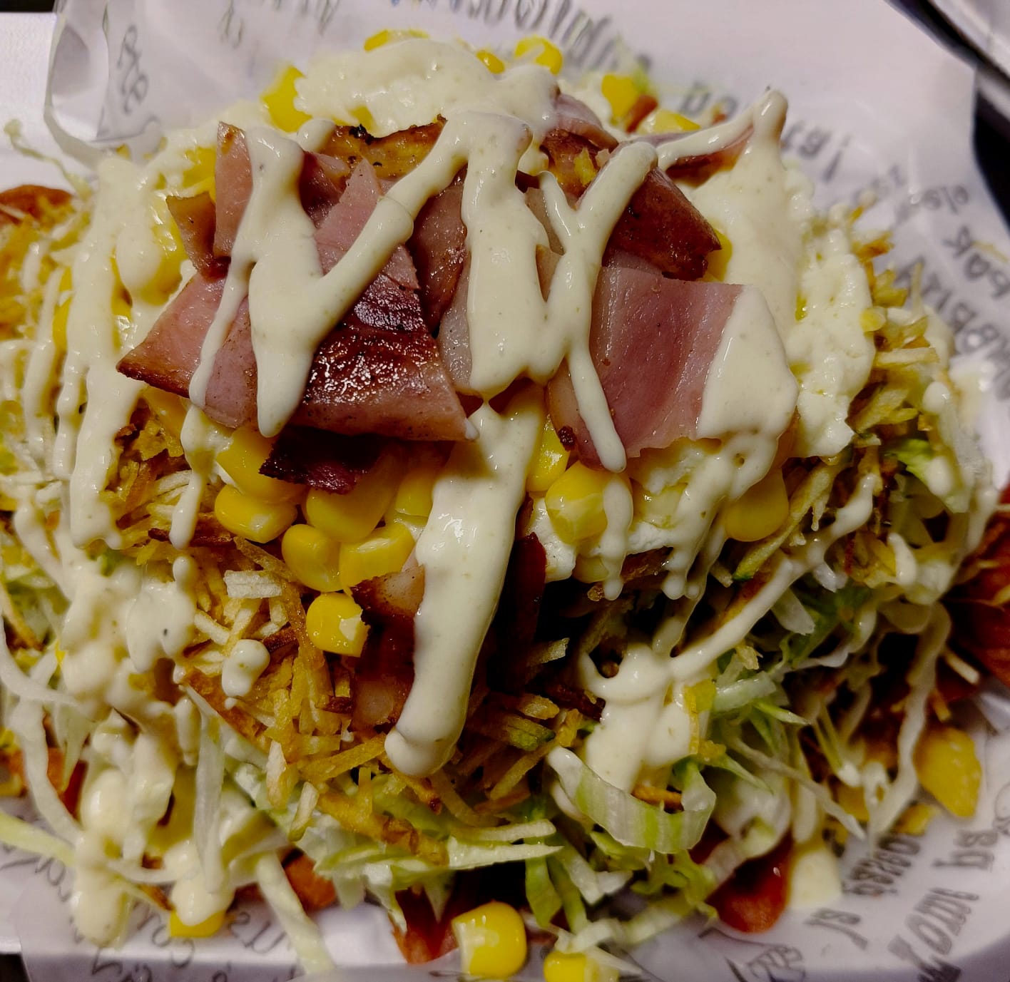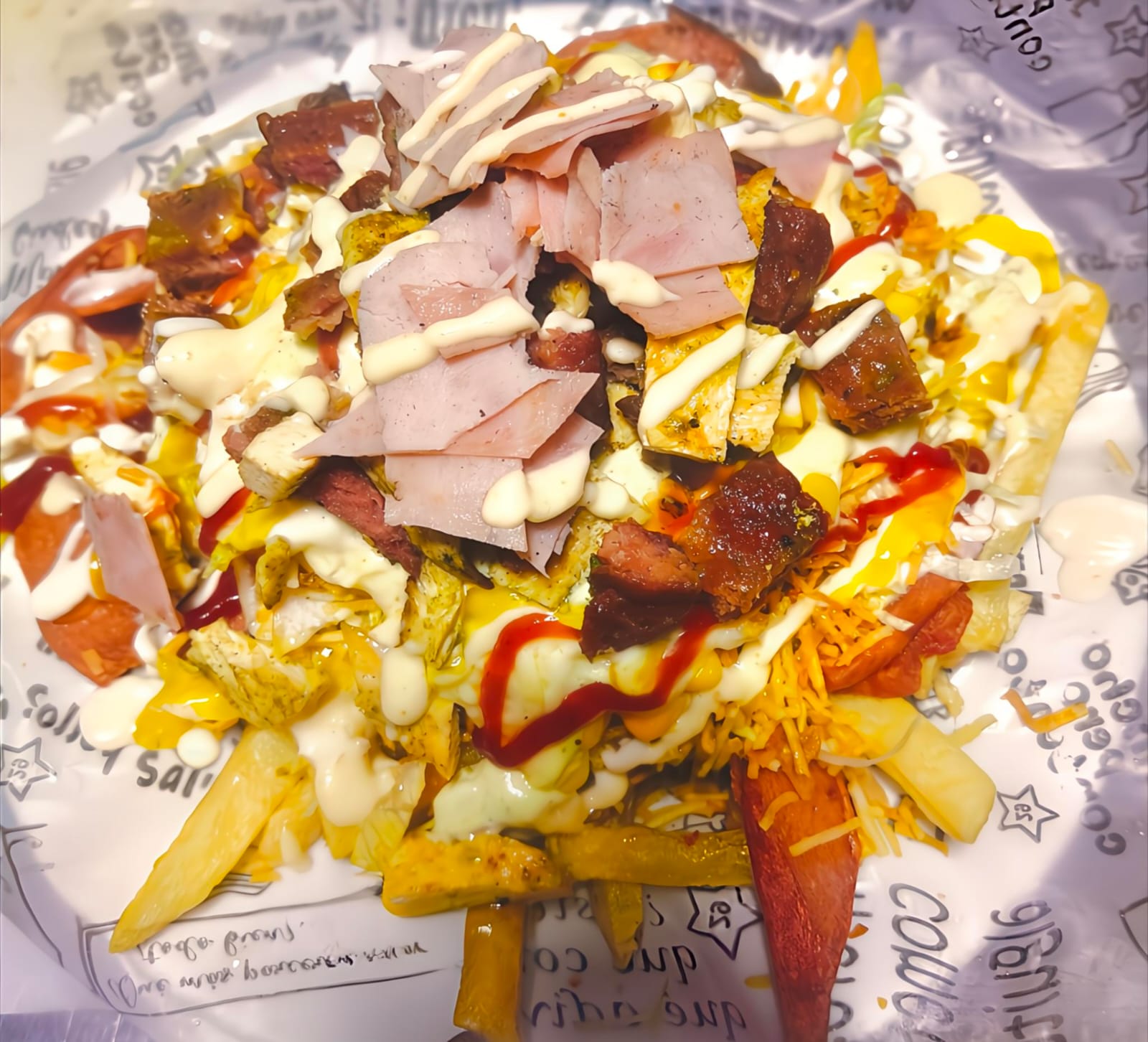 200 g De papas a la francesa, 200 gramos de salchicha, lechuga, ripio de papa, salsa de tomate, salsa de ajo, salsa verde, salsa de piña, salsa de la casa, queso gratinado y tocineta. Maximo para dos personas