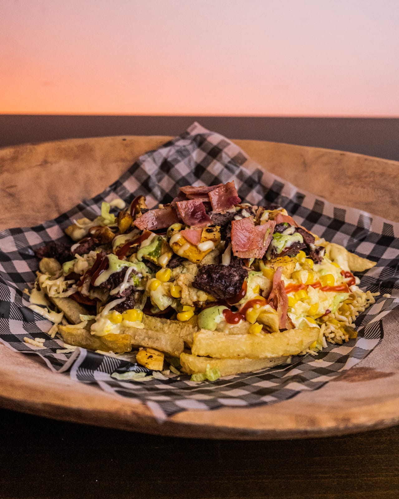 200 g De papas a la francesa, 200 gramos de chorizo, lechuga, salsa de la casa, ripio de papa, salsa de tomate, salsa de ajo, salsa verde, salsa de piña, salsa de la casa, queso gratinado, tocineta y maíz.