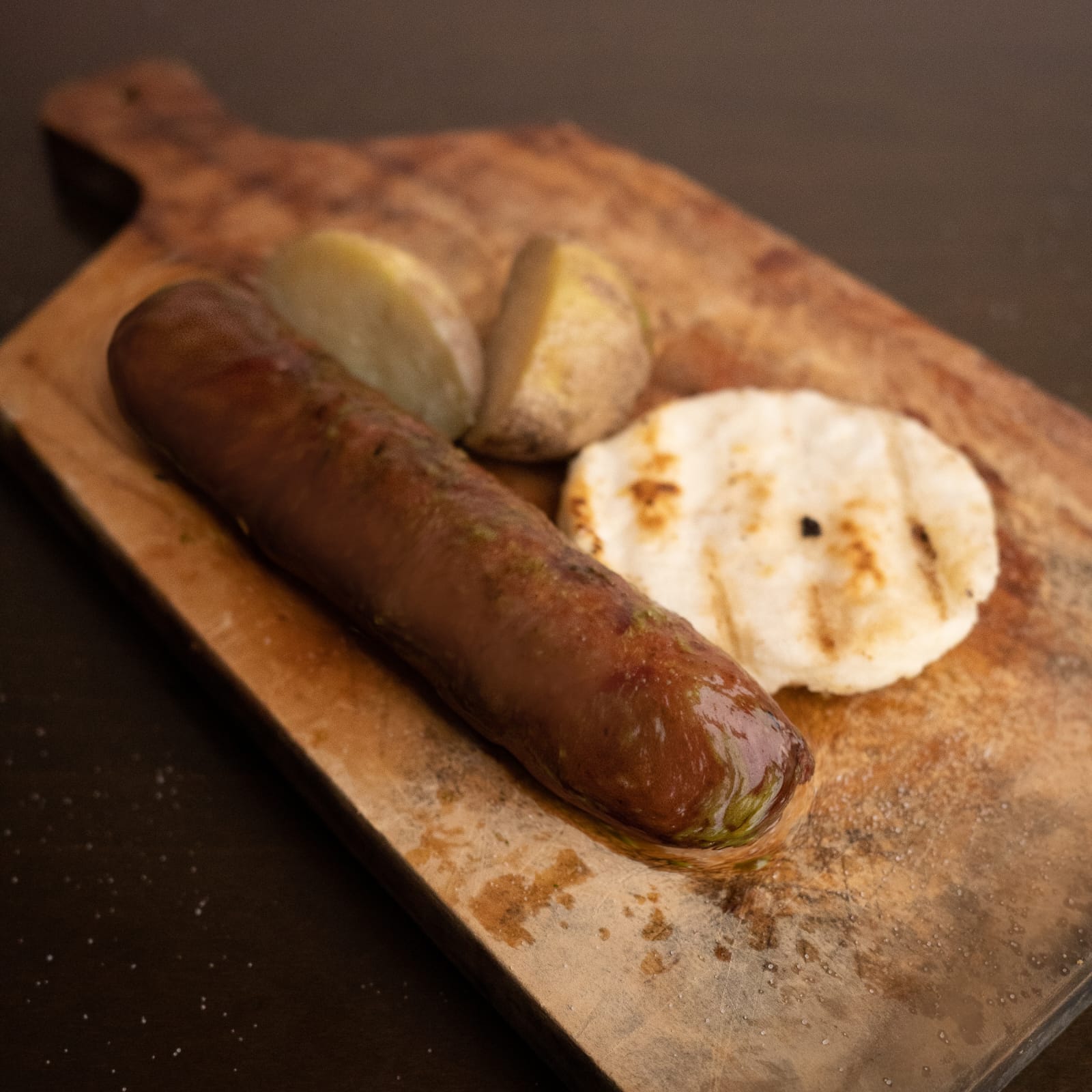 Chorizo de cerdo, papa cocida y arepa.