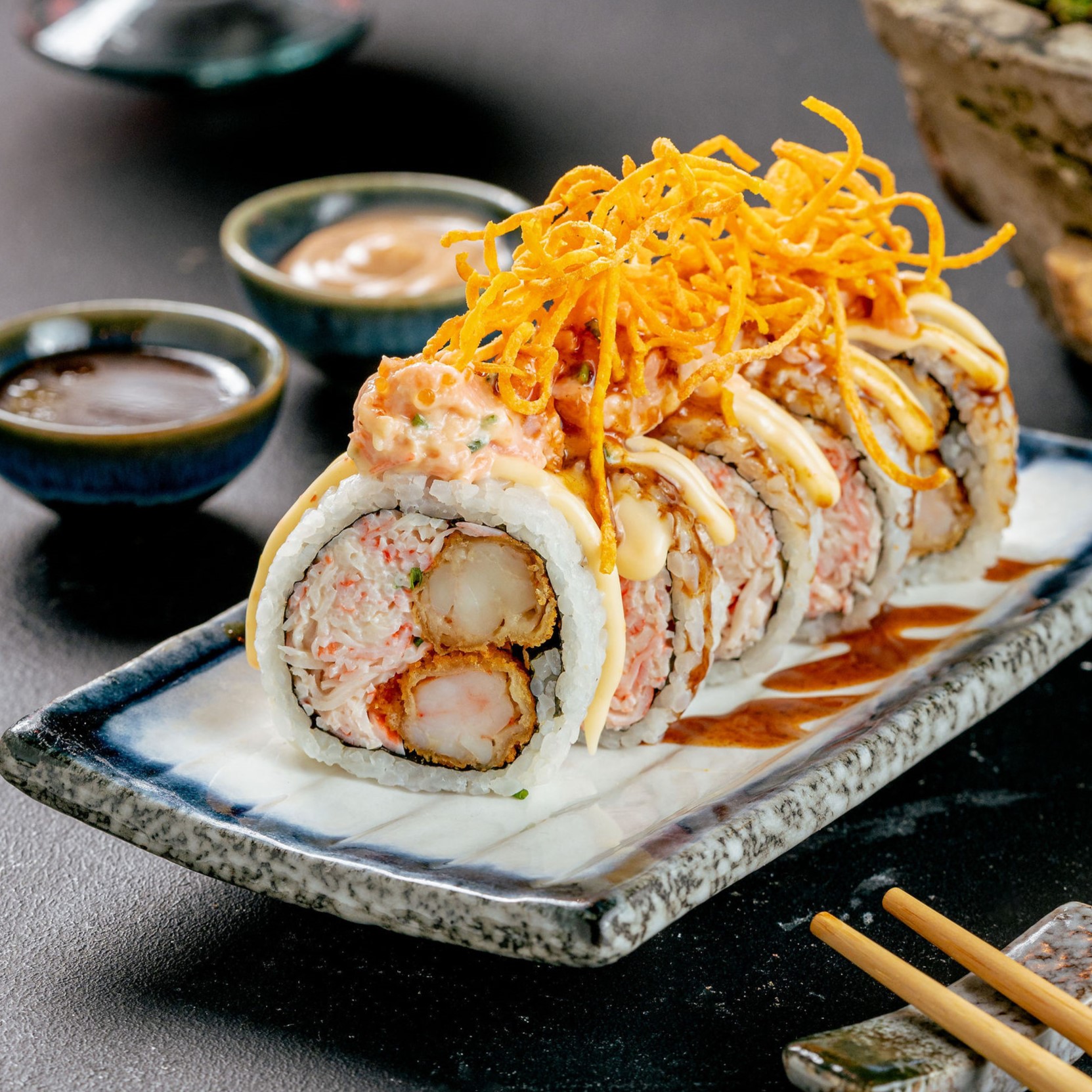 Roll relleno de langostinos al panko, ensalada dinamita, aromatizada con aceite de sésamo y cebollín, con un topping de fresco tartar de salmón, bañado en salsas spicy-mayo especial y teriyaki, coronado con crunchy de camote