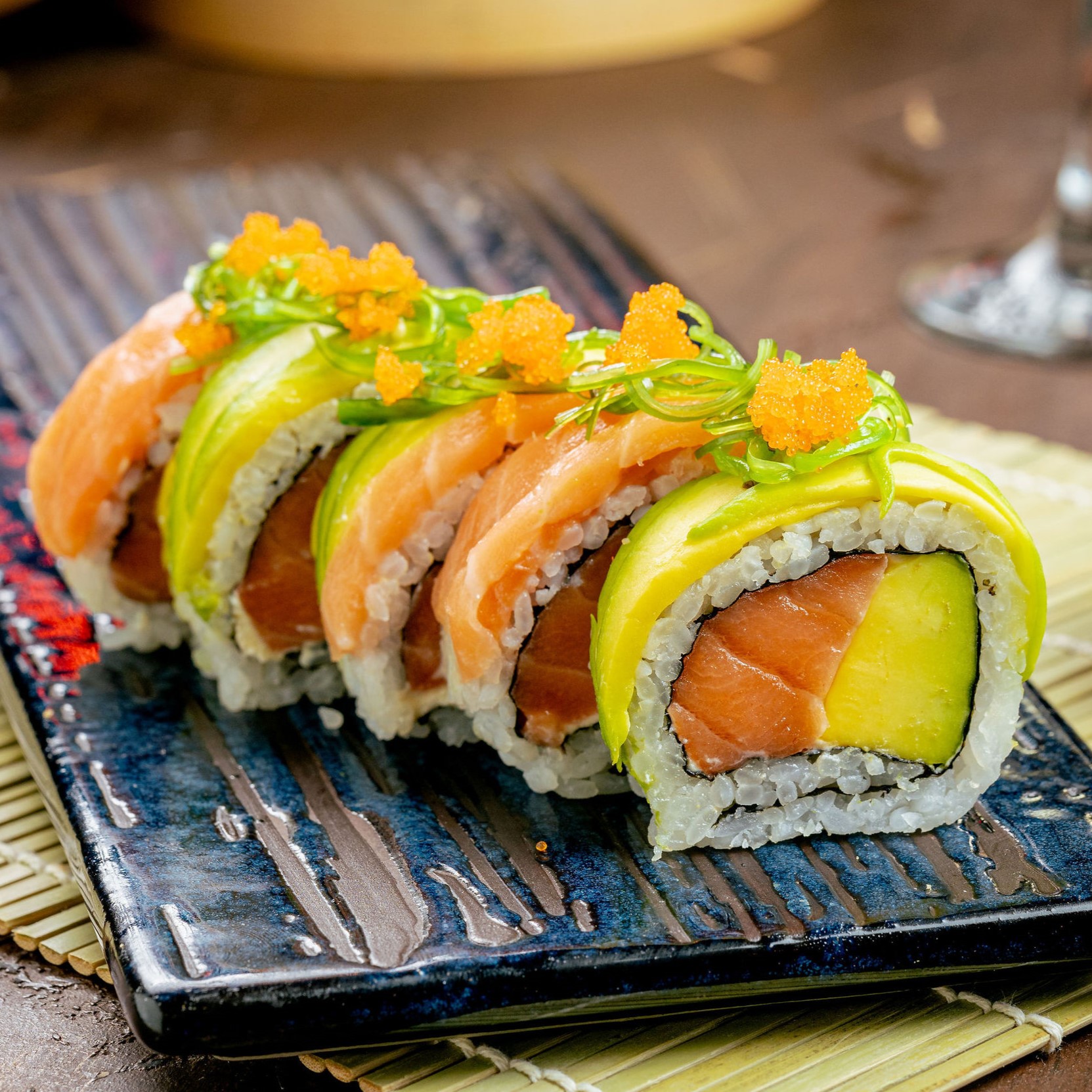 Roll con salmón, queso crema, topping de aguacate, salmón, wakame y masago