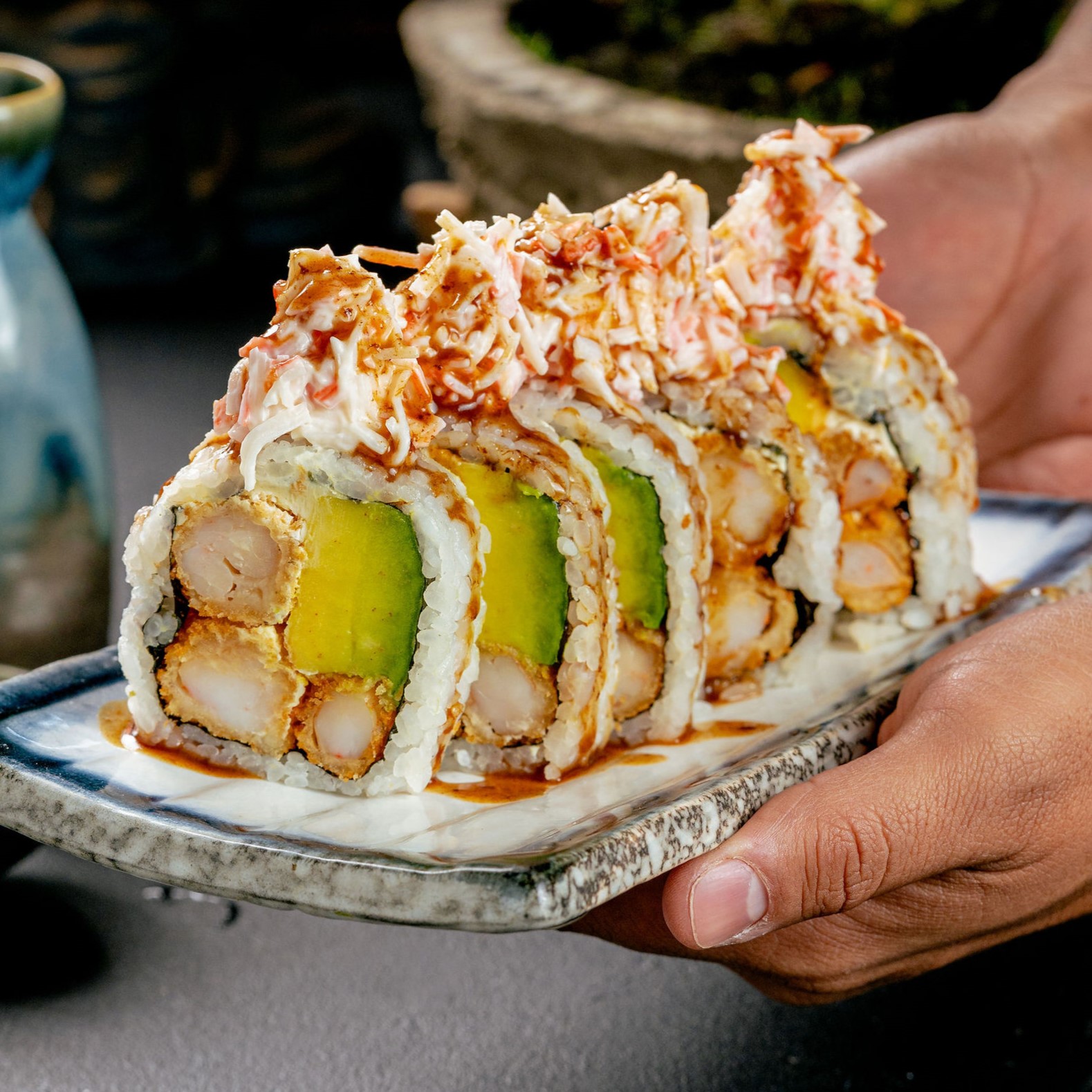 Roll apanado relleno de palmitos de cangrejo crocante con queso crema, aguacate bañados en salsa de mayo spicy y teriyaki