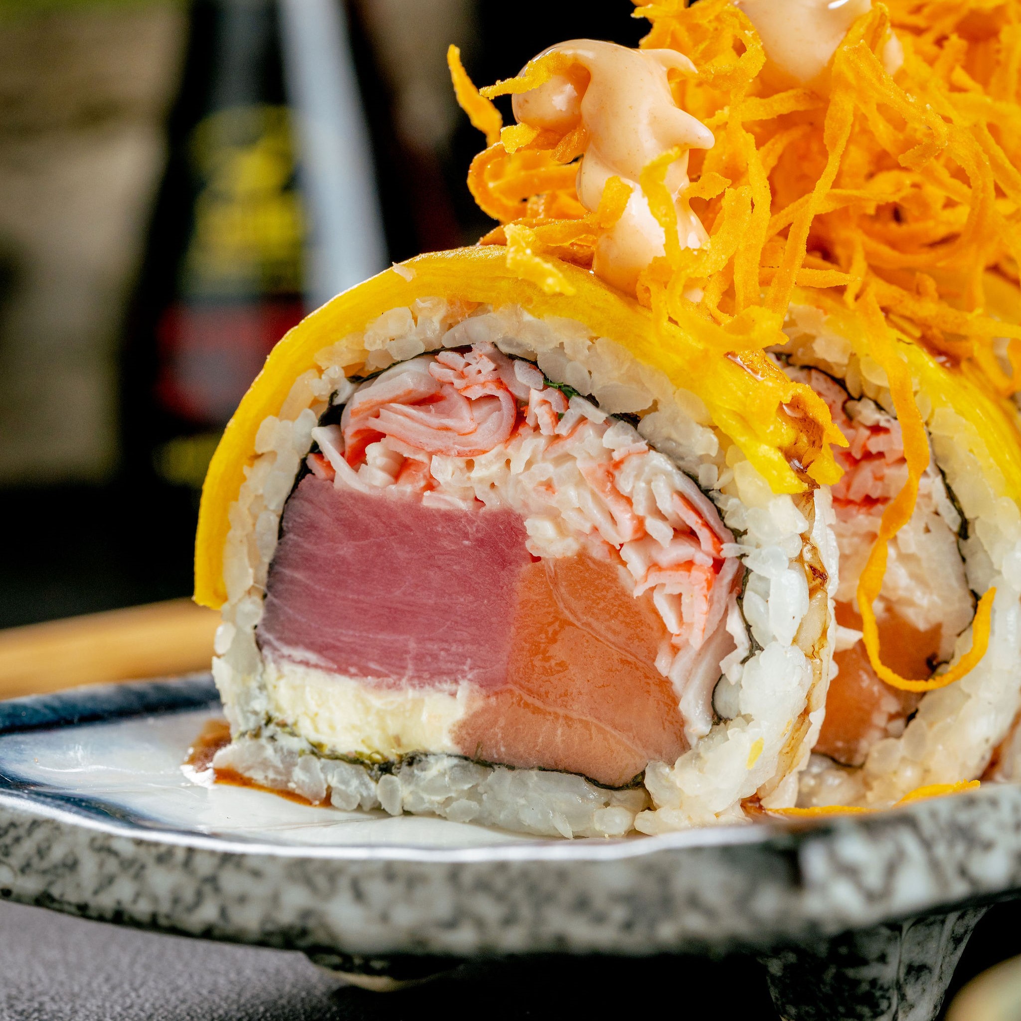 Roll relleno de cangrejo fresco, salmón y queso crema con topping de aguacate y tartar de atùn en sweet spicy mayo, bañado con salsa teriyaki